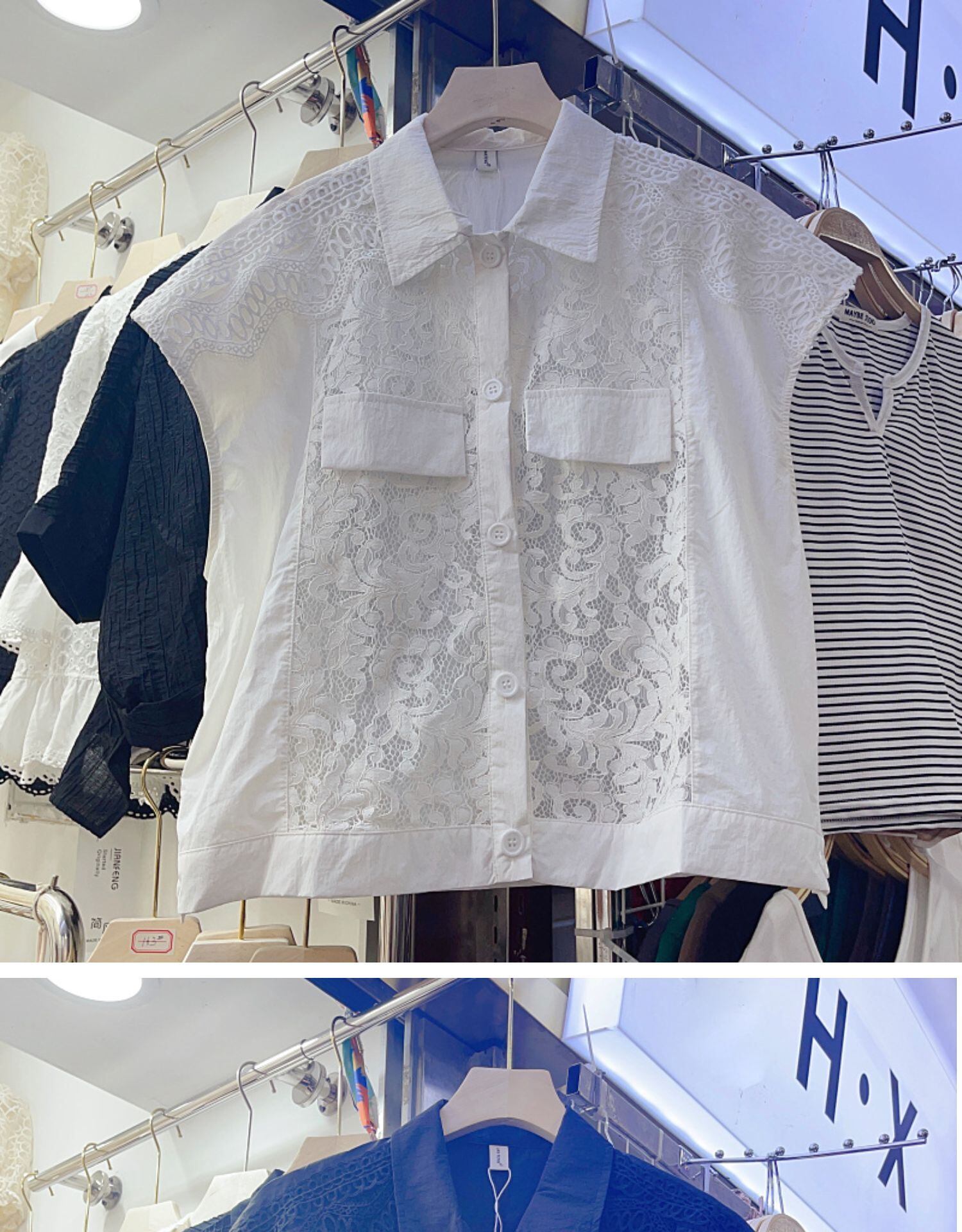 Nomikuma 夏シャツシック甘いレースパッチワークカジュアルブラウスターンダウンカラーノースリーブ 大人ガーリー スウィート キュート サマー 夏物