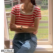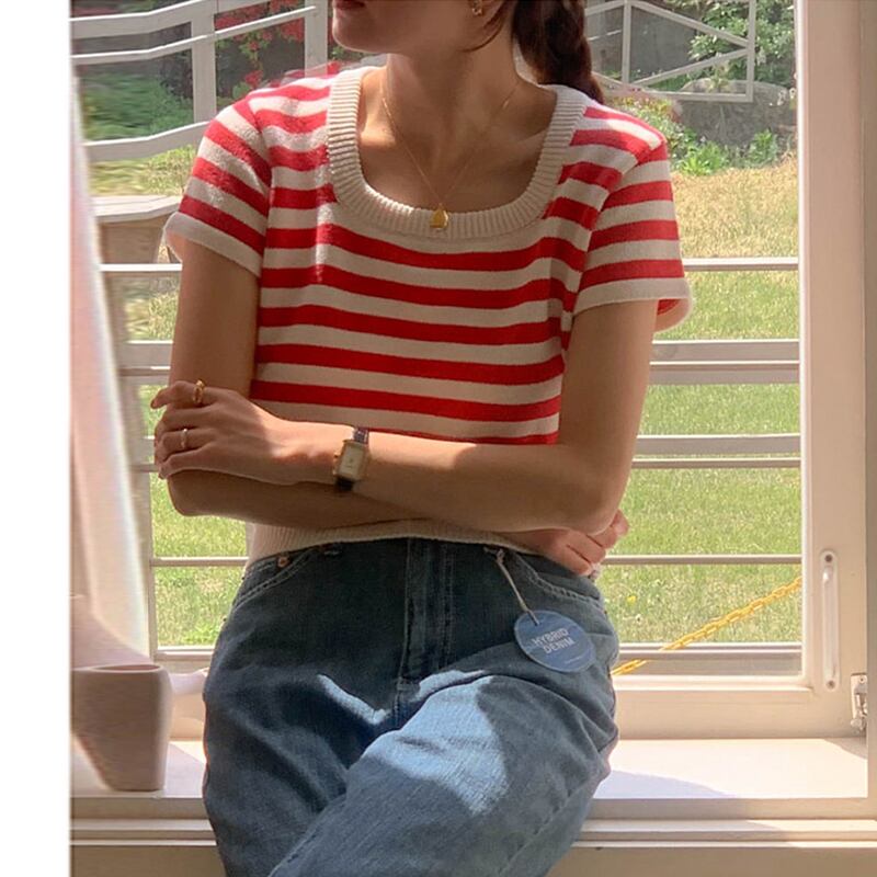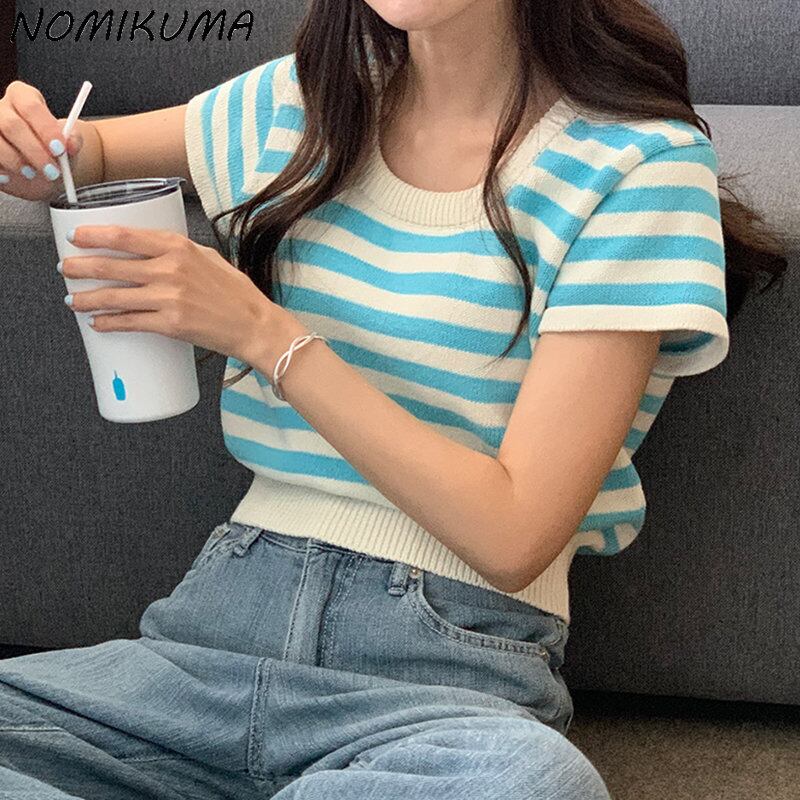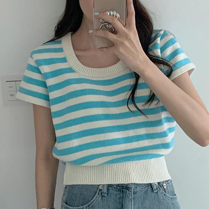 Nomikuma Koeran ストライプ半袖スクエアカラーニットシャツ Y2k トップ夏甘いグラフィック Tシャツ ショート ハーフスリーブ 大人ガーリー スウィート キュート カジュアル サマー 夏物 スクウェア