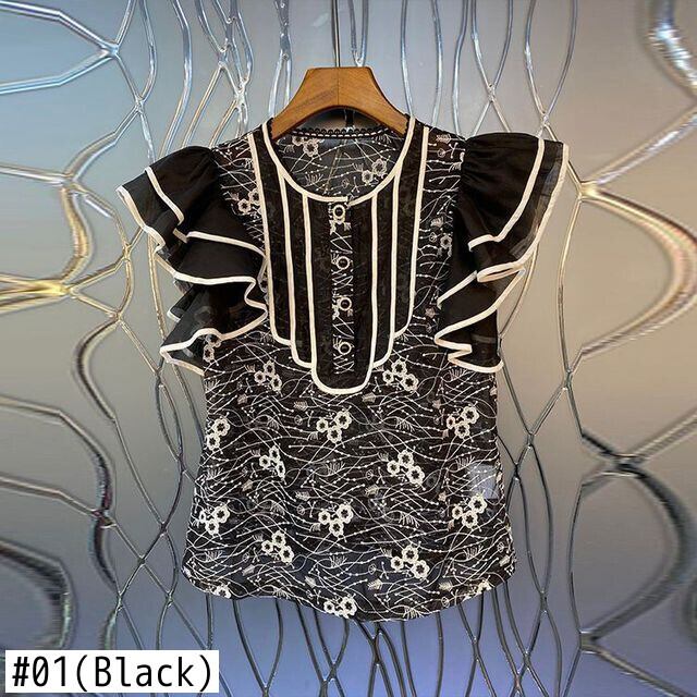 Nomikuma パッチワークフリルノースリーブ Y2k トップシャツ因果 O ネックシックグラフィック Tシャツ夏トップス サマー 夏物 Oネック
