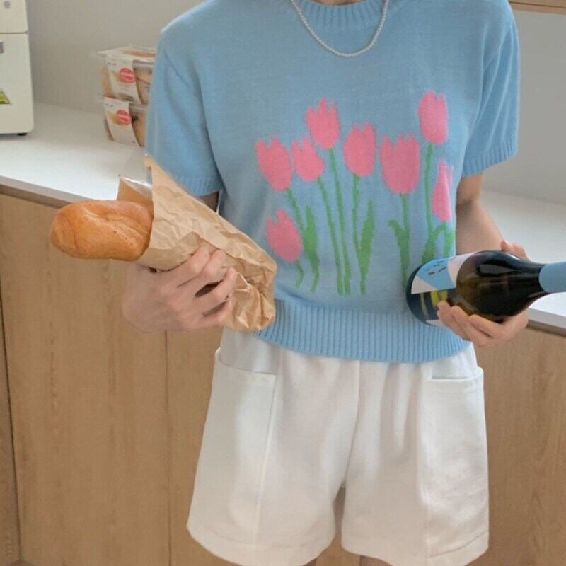 Nomikuma 花因果半袖プルオーバーニット Y2k トップ夏ゴシックグラフィック T シャツ ショート ハーフスリーブ サマー 夏物 Tシャツ フラワーデザイン
