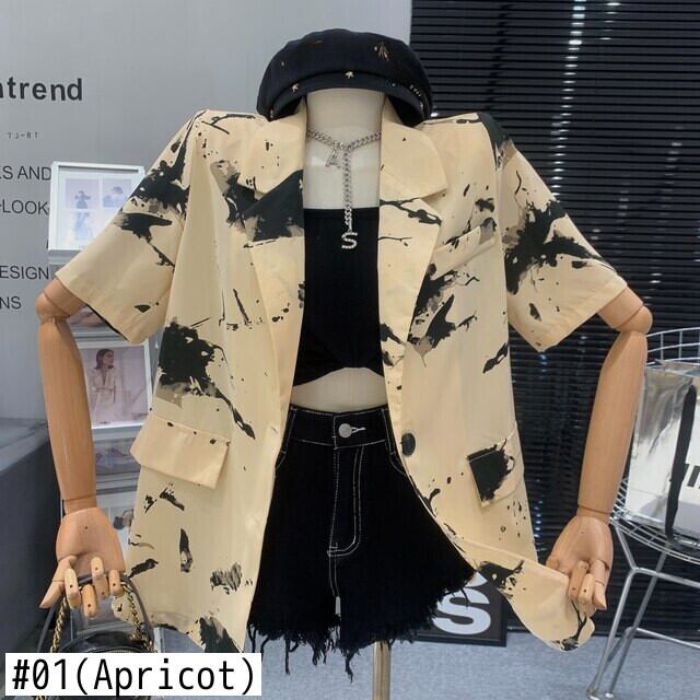 Nomikuma 夏半袖花落書きテーラードコートターンダウン襟半袖ブレザーデモーダ ショート レッド ハーフスリーブ サマー 夏物 花柄