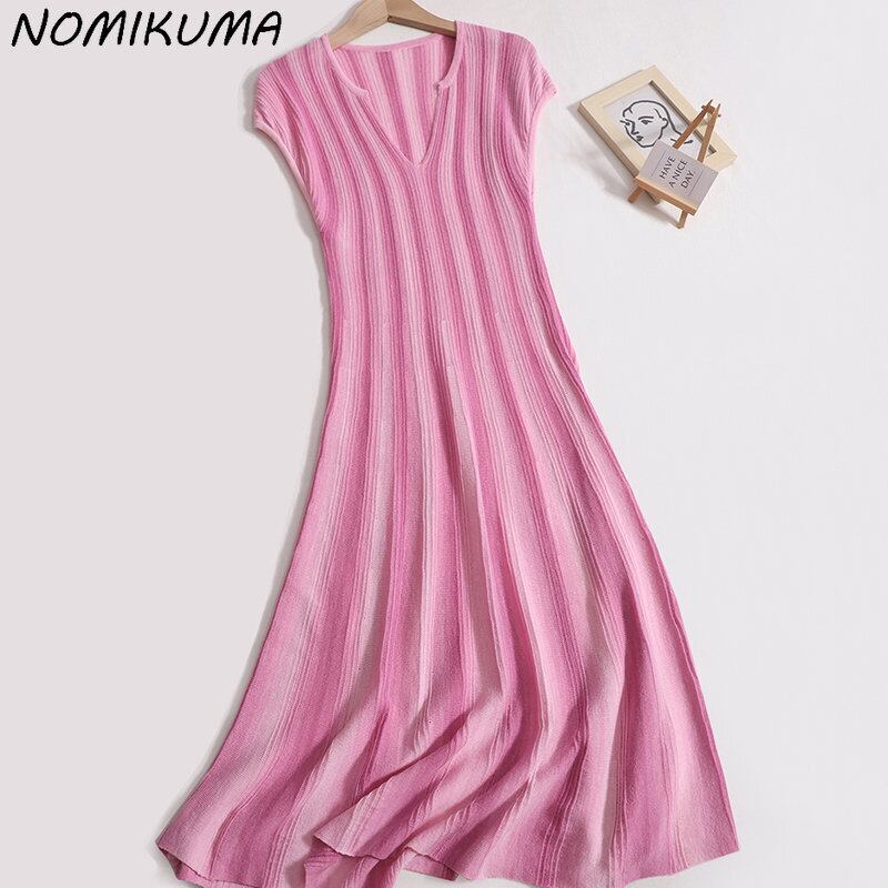 Nomikuma ノースリーブ V ネックセータードレスヒットカラーストライプニットロングローブサマードレス 夏物 Vネック