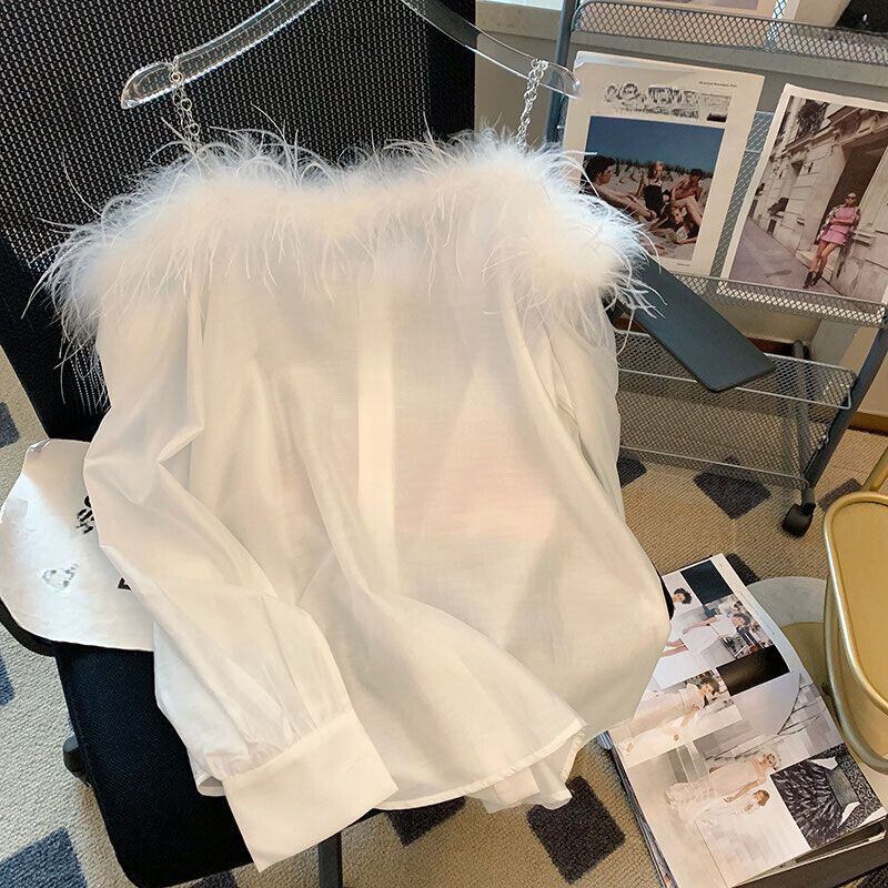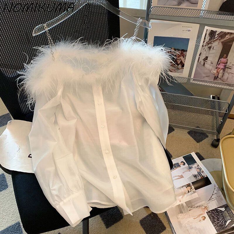 Nomikuma ファーパッチワークオフショルダーブラウストップス長袖夏薄いシャツ ロング サマー 夏物