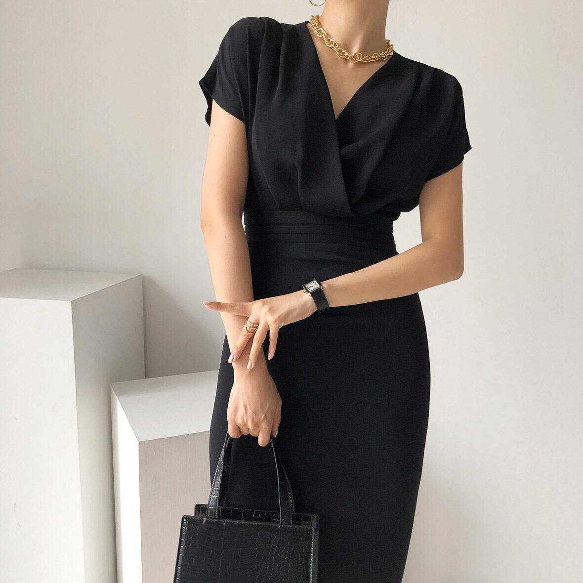 Nomikuma V ネックひだ半袖ドレススリムウエストバックスプリットサマードレス Vestidos ショート ハーフスリーブ 夏物 Vネック