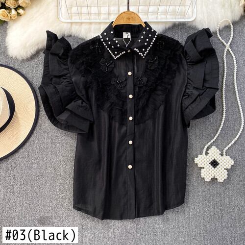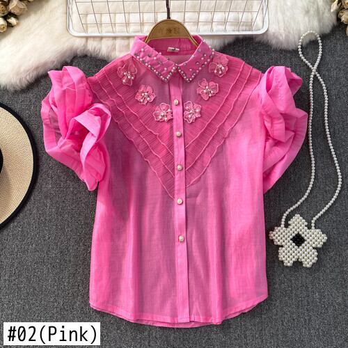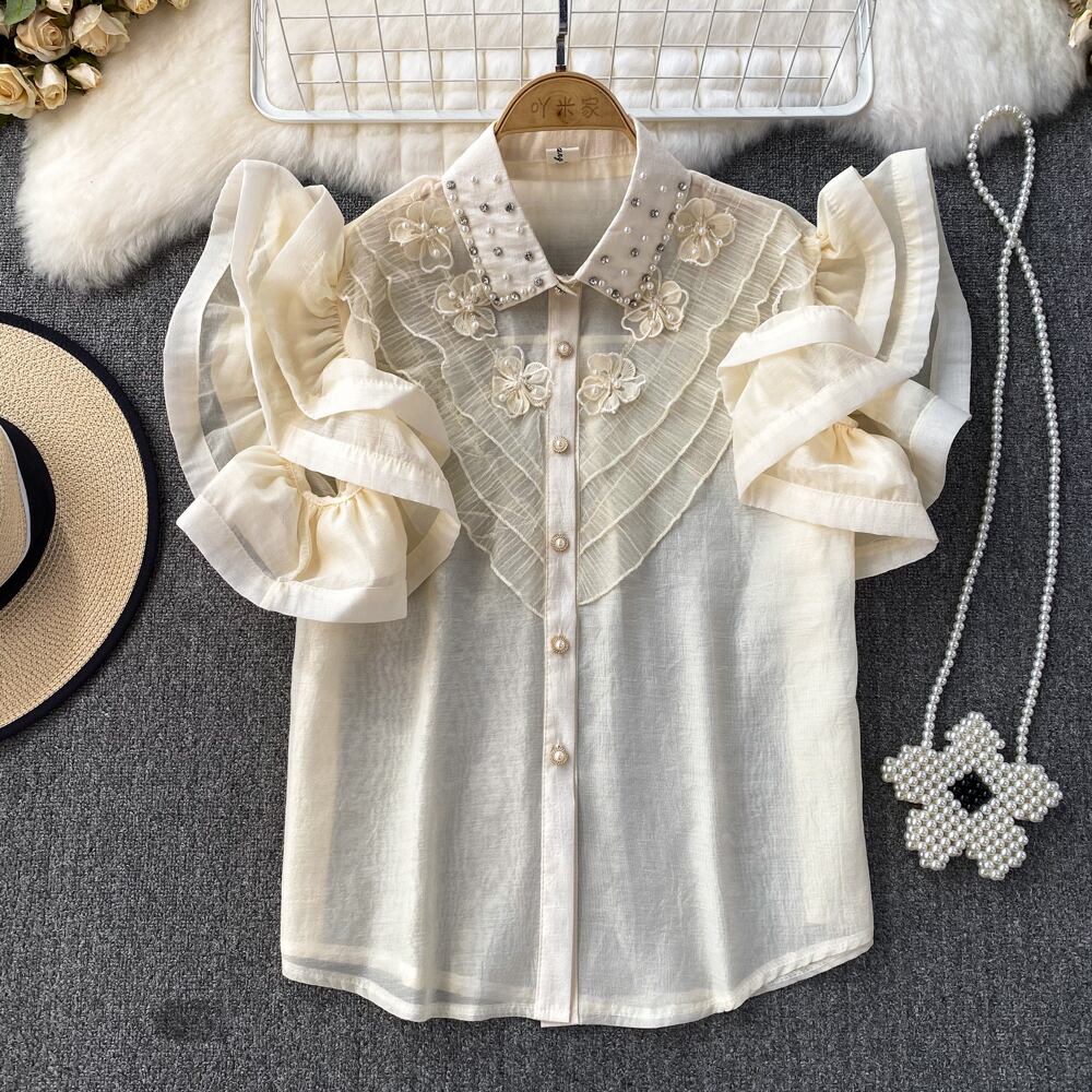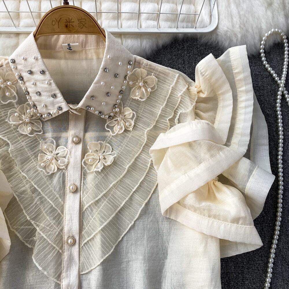Nomikuma フレアスリーブビーズダイヤモンド 3D 花パッチワークシングルブレストブラウス因果甘い 大人ガーリー スウィート キュート カジュアル フラワーデザイン