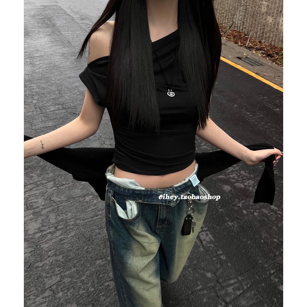 Nomikuma Y2k トップオフショルダーセクシーストラップレススパイシーガールシャツ夏半袖ソリッドグラフィック Tシャツ ショート ハーフスリーブ サマー 夏物 ソリッドカラー