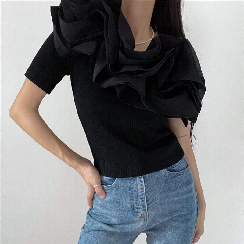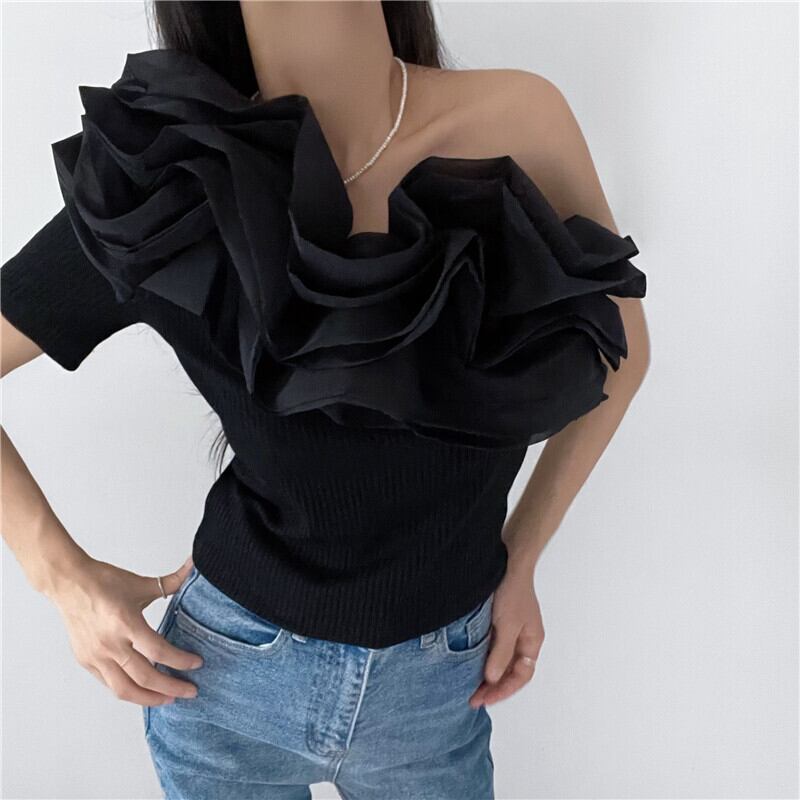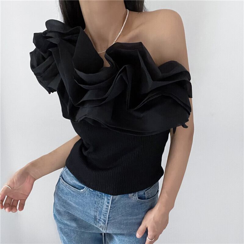 Nomikuma オフショルダーセクシーストラップレスグラフィック Tシャツシックフリルパッチワーク Y2k トップ夏スリムシャツ サマー 夏物