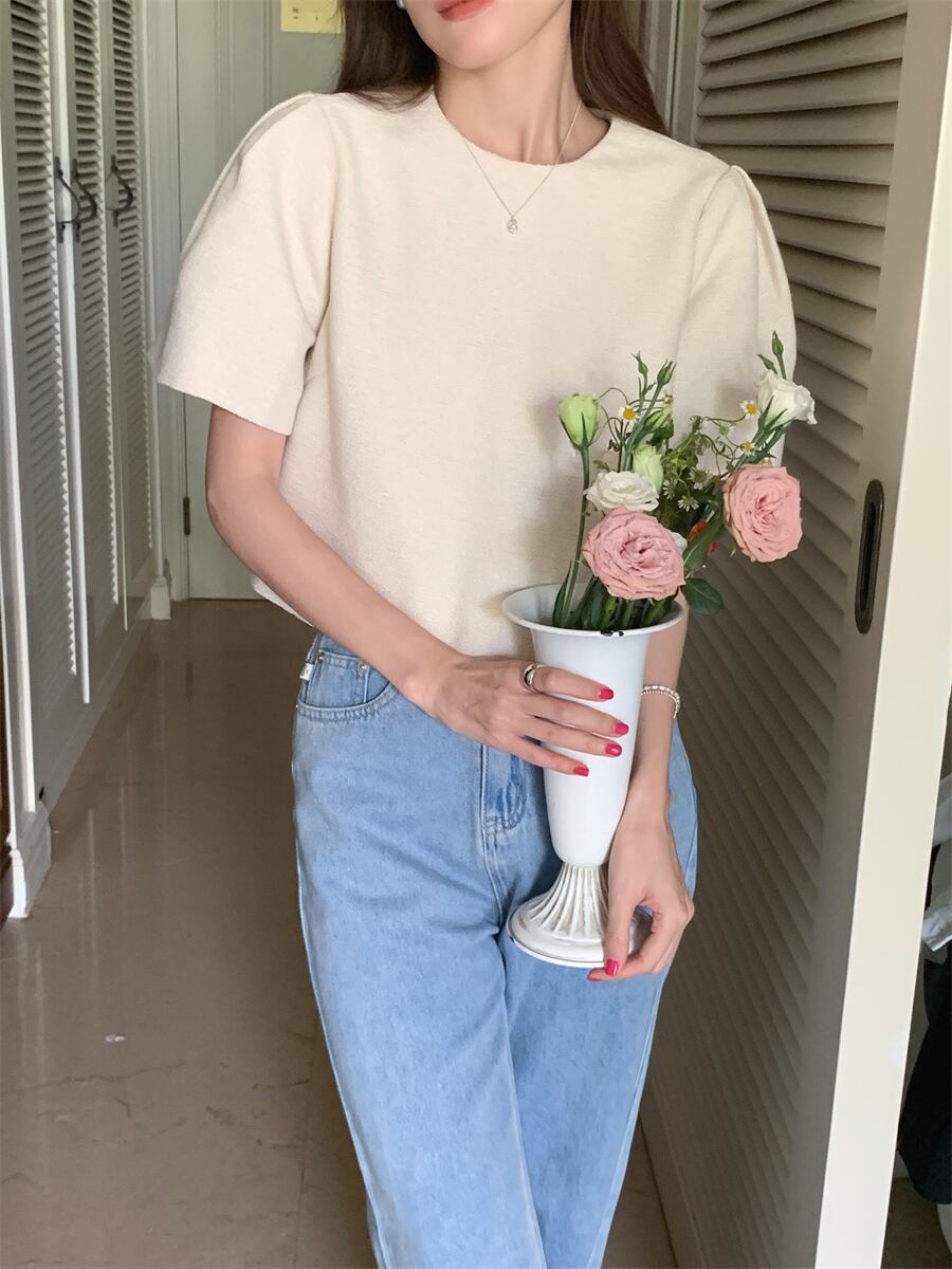 Nomikuma バックボタンブラウス夏シックパフスリーブ O ネックシャツ因果甘いデ 大人ガーリー スウィート キュート カジュアル サマー 夏物 Oネック