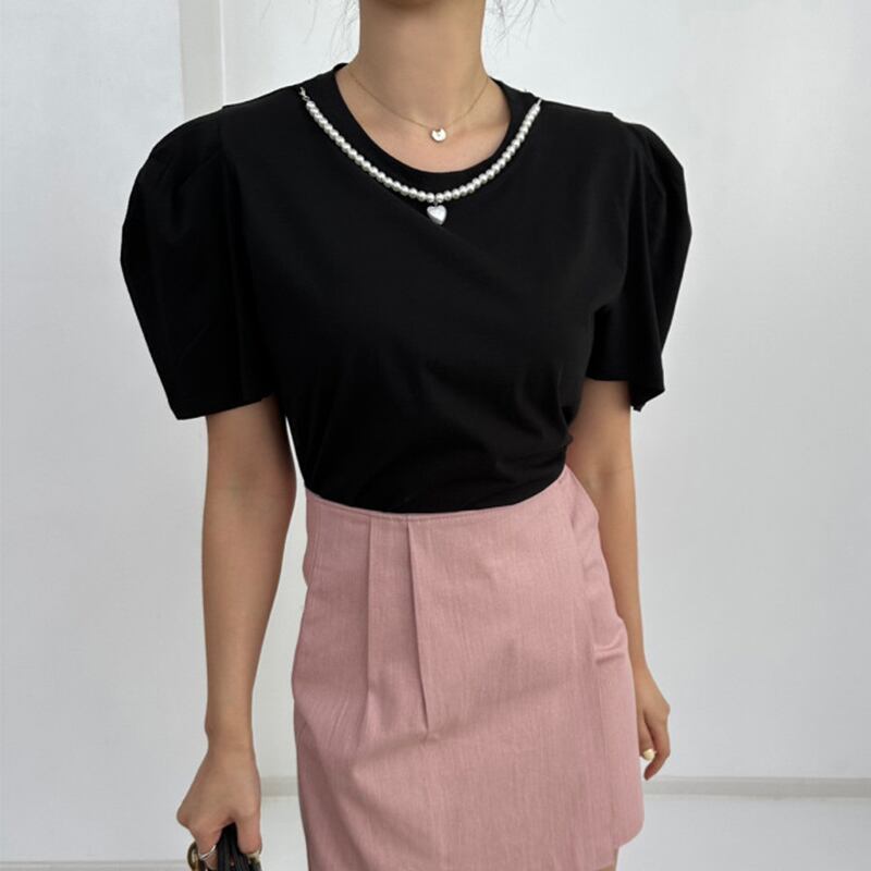 Nomikuma シックビーズチェーン半袖ゴシックシャツ夏パフスリーブ O ネックソリッドグラフィック T シャツ ショート ハーフスリーブ サマー 夏物 Oネック Tシャツ ソリッドカラー