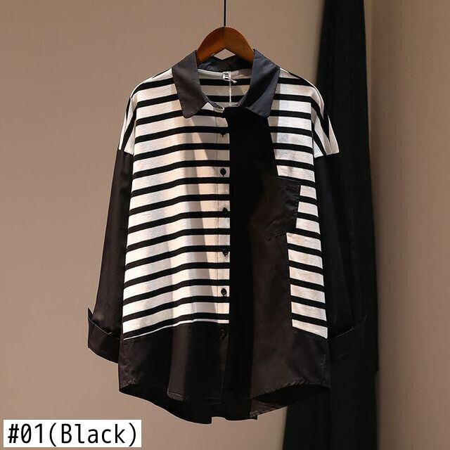Nomikuma ストライプパッチワーク因果不規則長袖トップスターンダウンカラーブラウスデ ロング