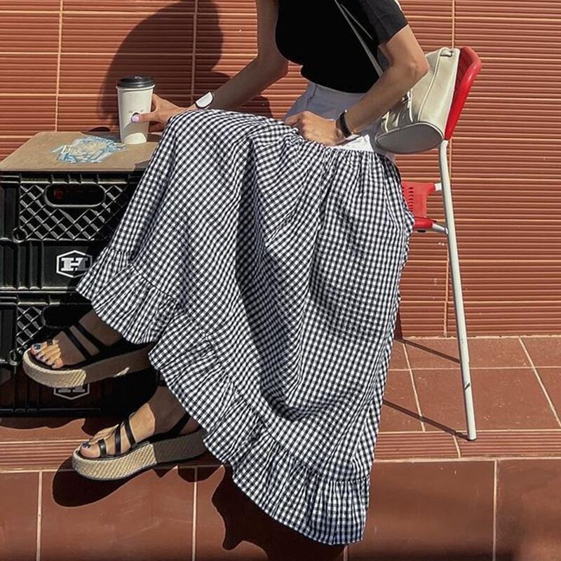Nomikuma Cintage ウエストパッチワークチェック柄 Y2k スカートレディース夏ボトムス因果フリル A ラインゴススカート サマー 夏物 Aライン