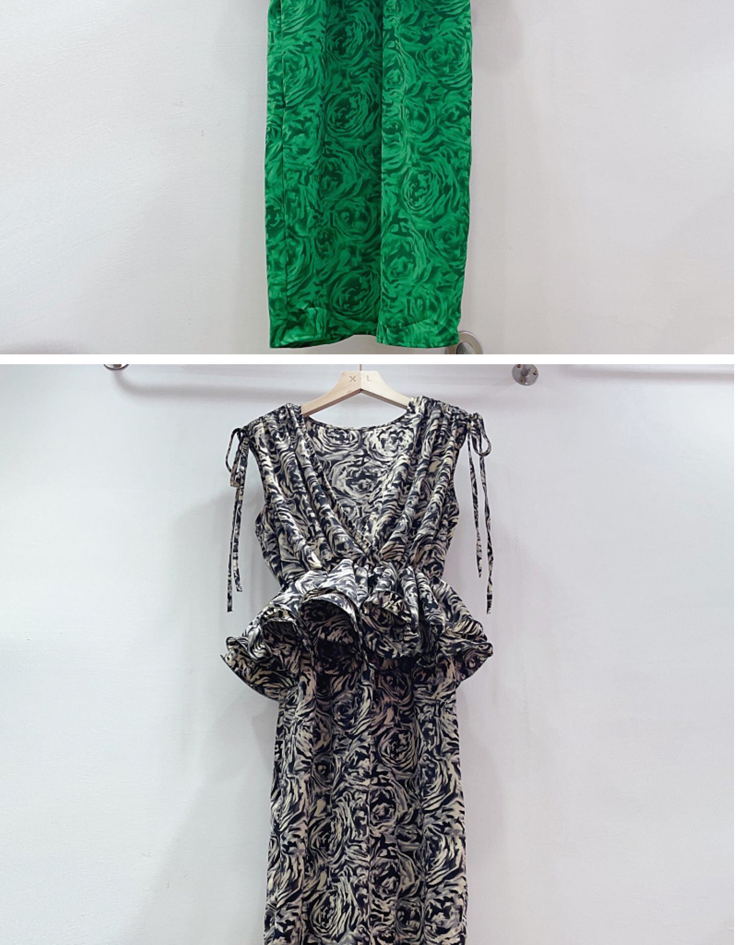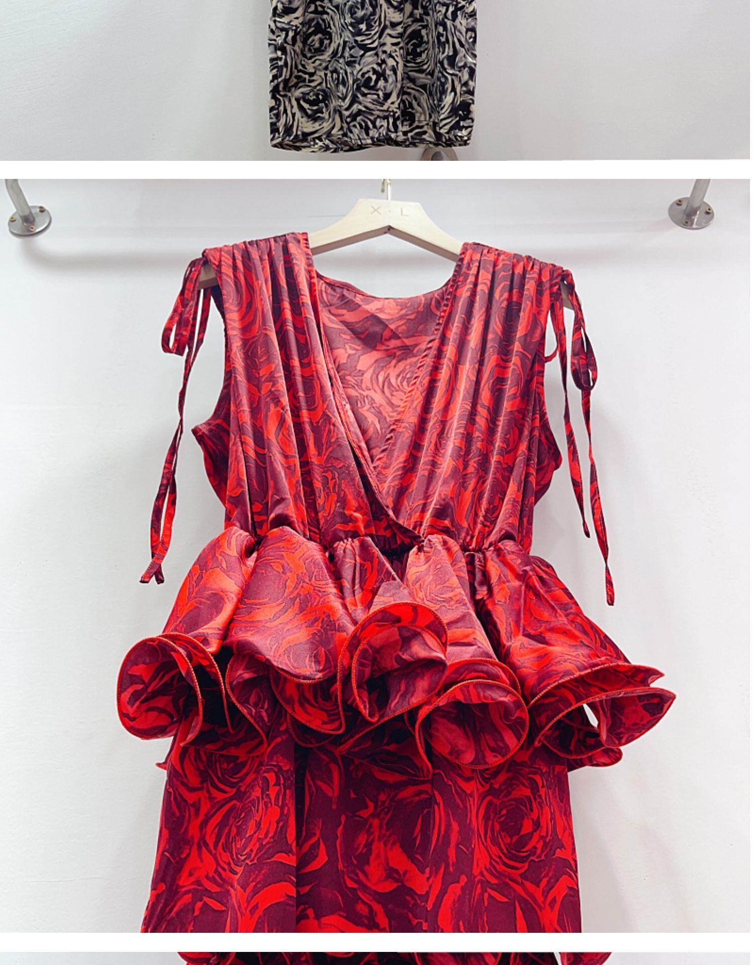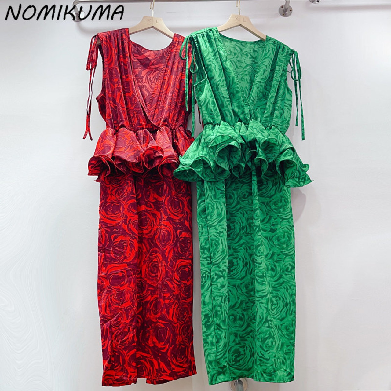 Nomikuma 夏 V ネック レトロ プリント ノースリーブ ドレス フリル エッジ ラップ ヒップ ドレス サマー 夏物 Vネック