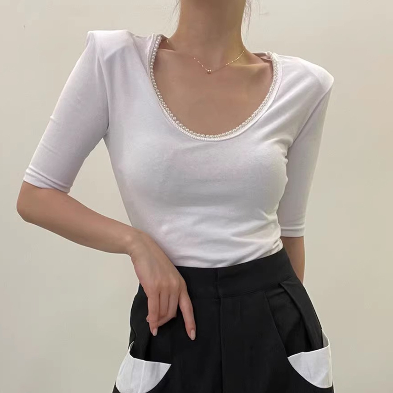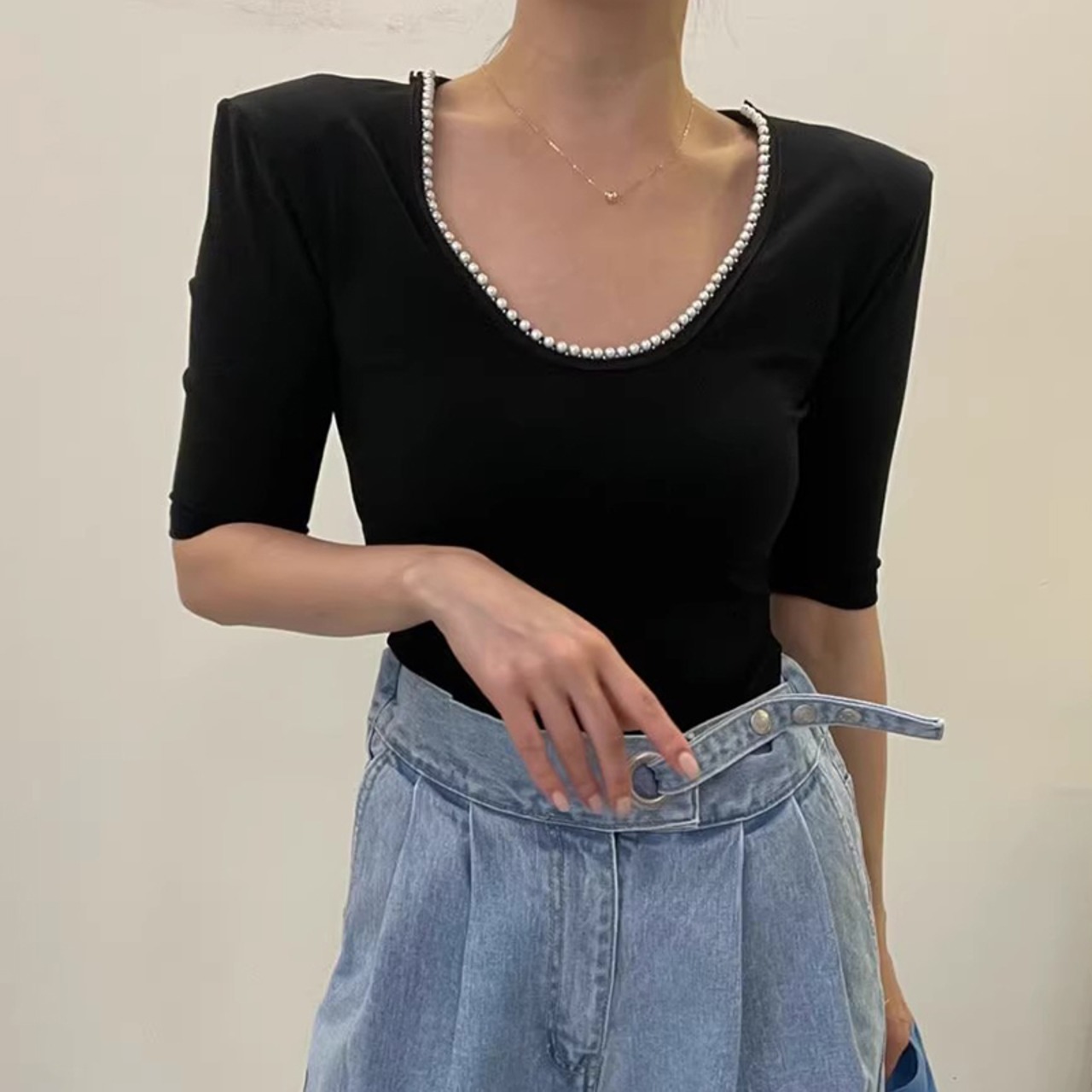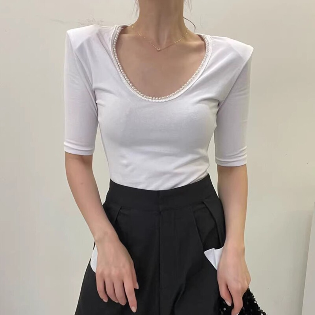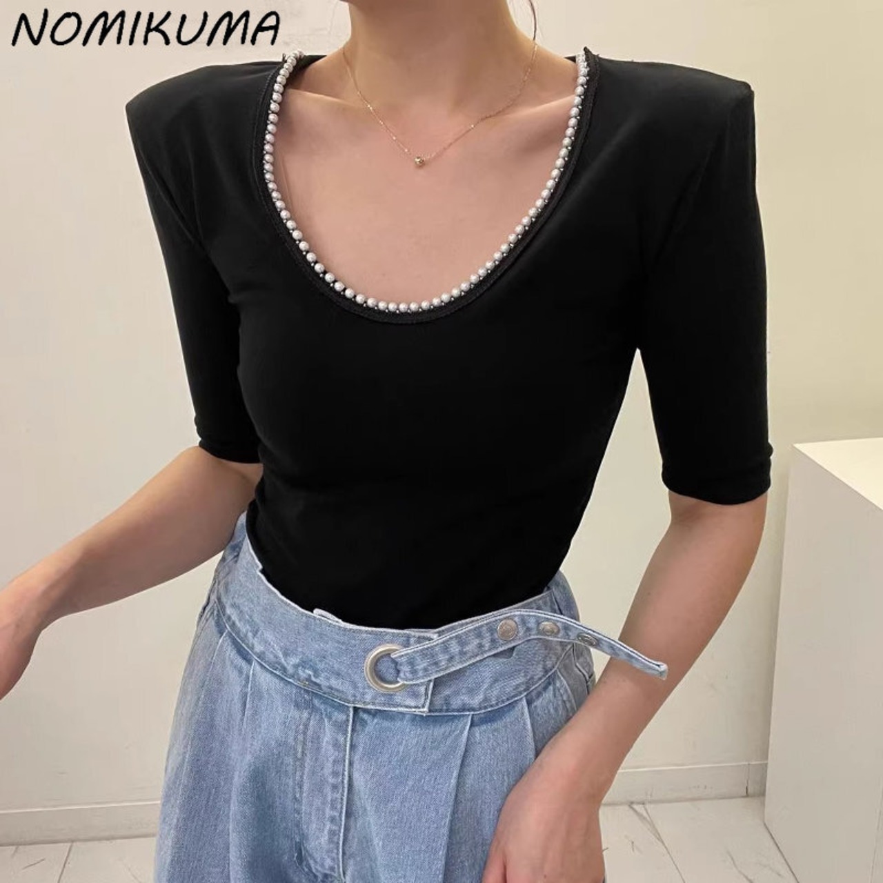 Nomikuma ビーズ O ネックスリムグラフィック Tシャツ弾性ゴシック Y2k トップ Sumemr ボトリングシャツ エラスティック 伸縮 Oネック ソリッドカラー
