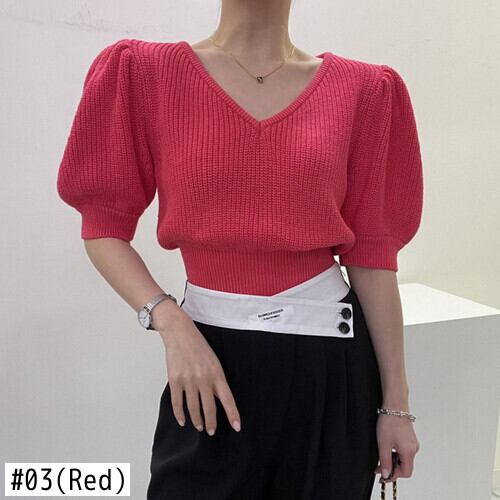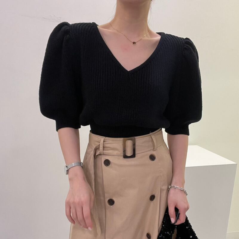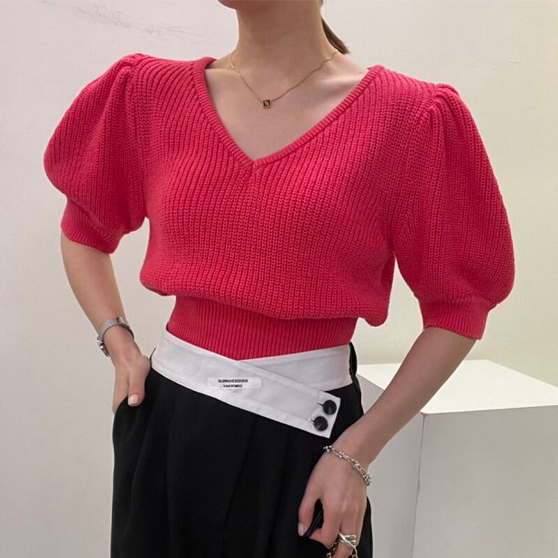 Nomikuma スリムウエストショートニットトップスシック夏パフスリーブ V ネックニットセーター因果プルオーバー サマー 夏物 Vネック ソリッドカラー