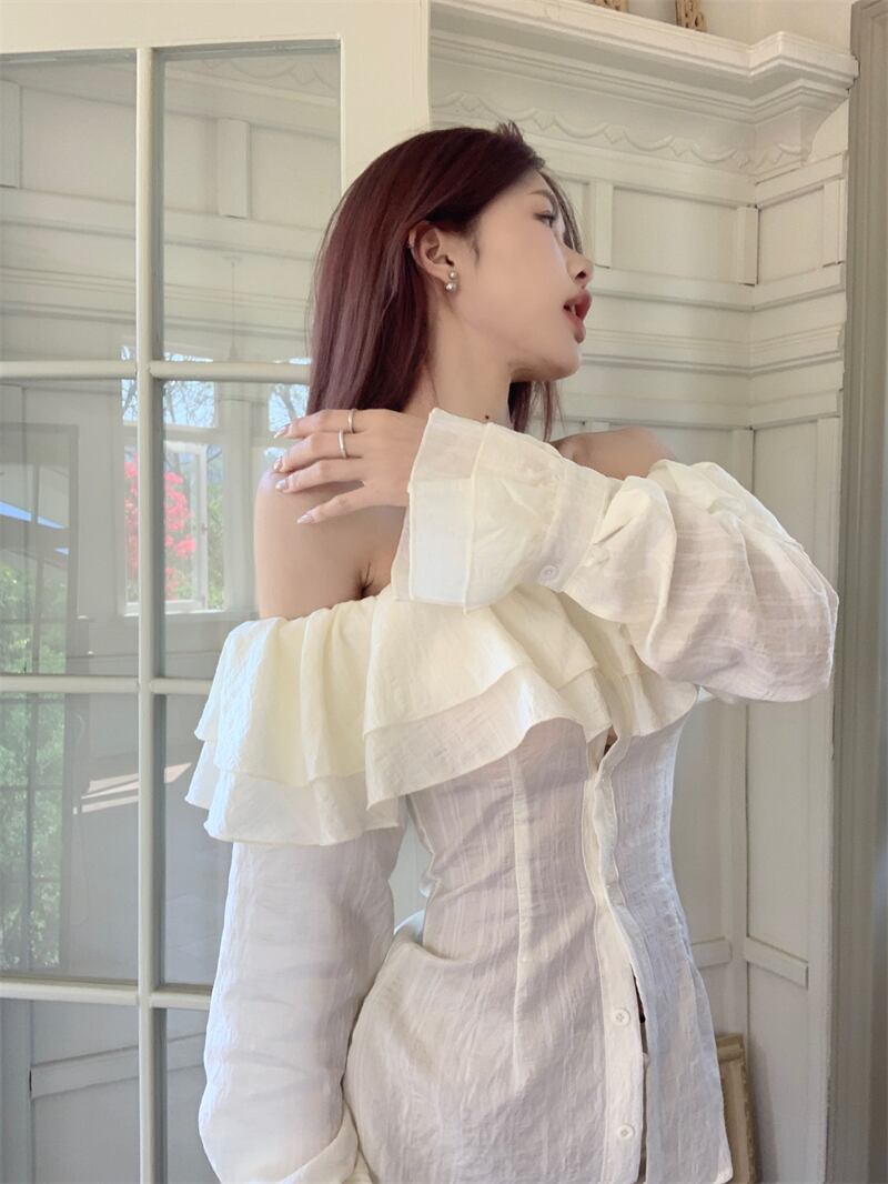 Nomikuma セクシーストラップレスオフショルダーフリルブラウススリムウエストシャツ夏長袖トップス ロング サマー 夏物
