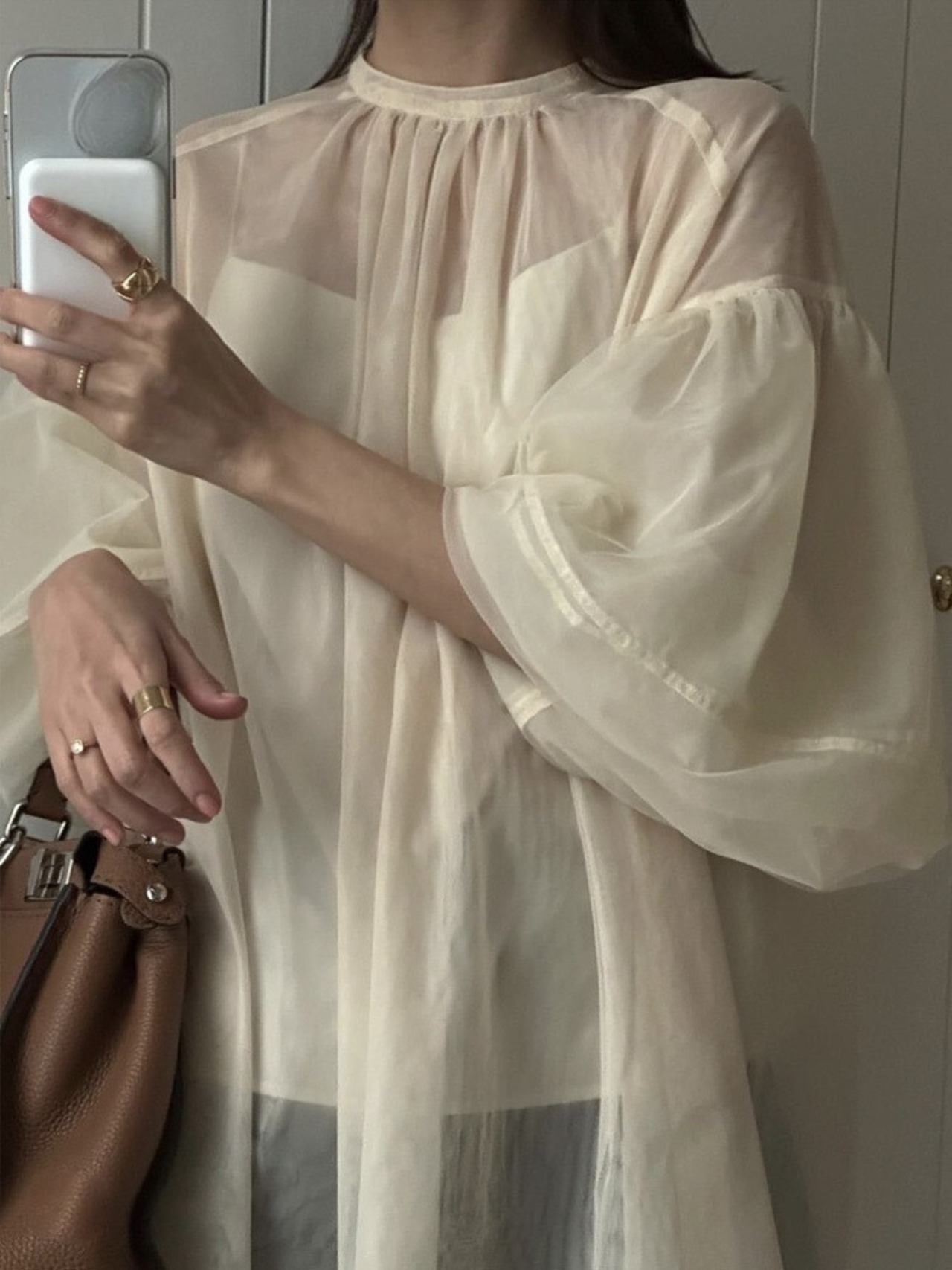 Nomikuma スタイル 2 ピーストップセットシースルーメッシュパフスリーブシャツ + ベーシックスリングベストサマートップス 夏物