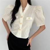 Nomikuma ヒットカラー シングルブレスト V ネック ブラウス レディース 夏 パフ スリーブ シャツ デ サマー 夏物 Vネック