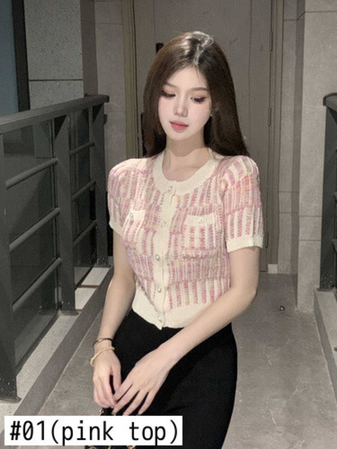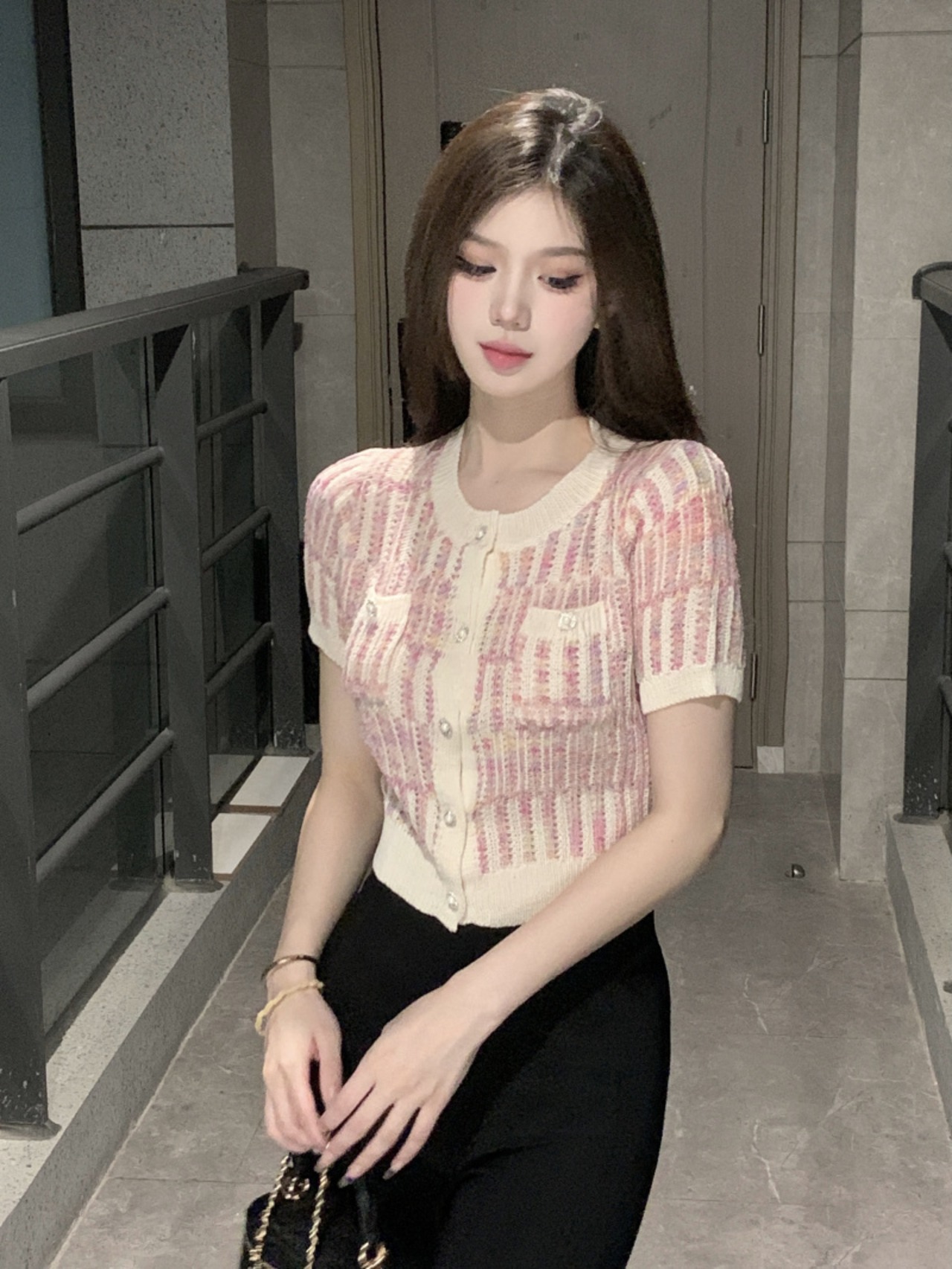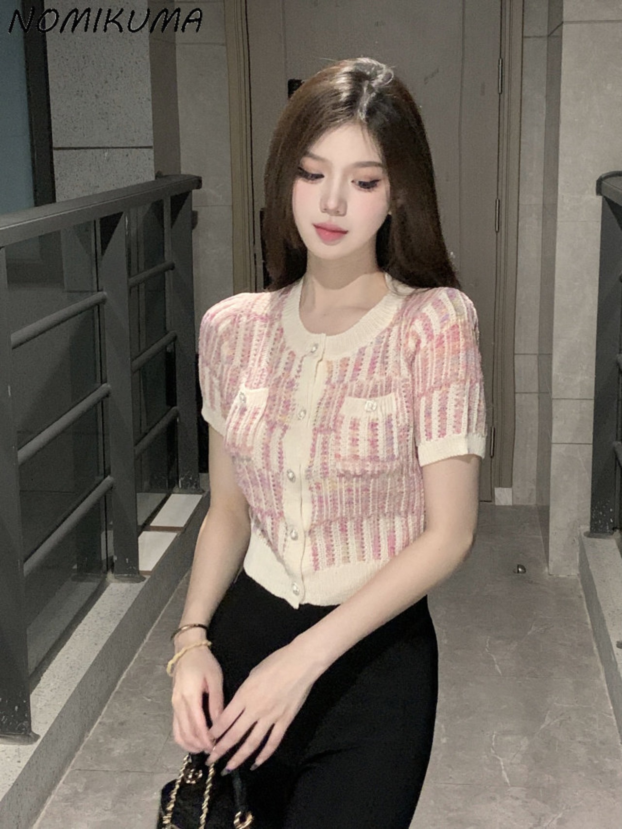 Nomikuma ストライプ O ネック半袖ニットカーディガン夏甘いセクシースパイシーガールニットスリムセーターコート ショート ハーフスリーブ 大人ガーリー スウィート キュート カジュアル サマー 夏物 Oネック