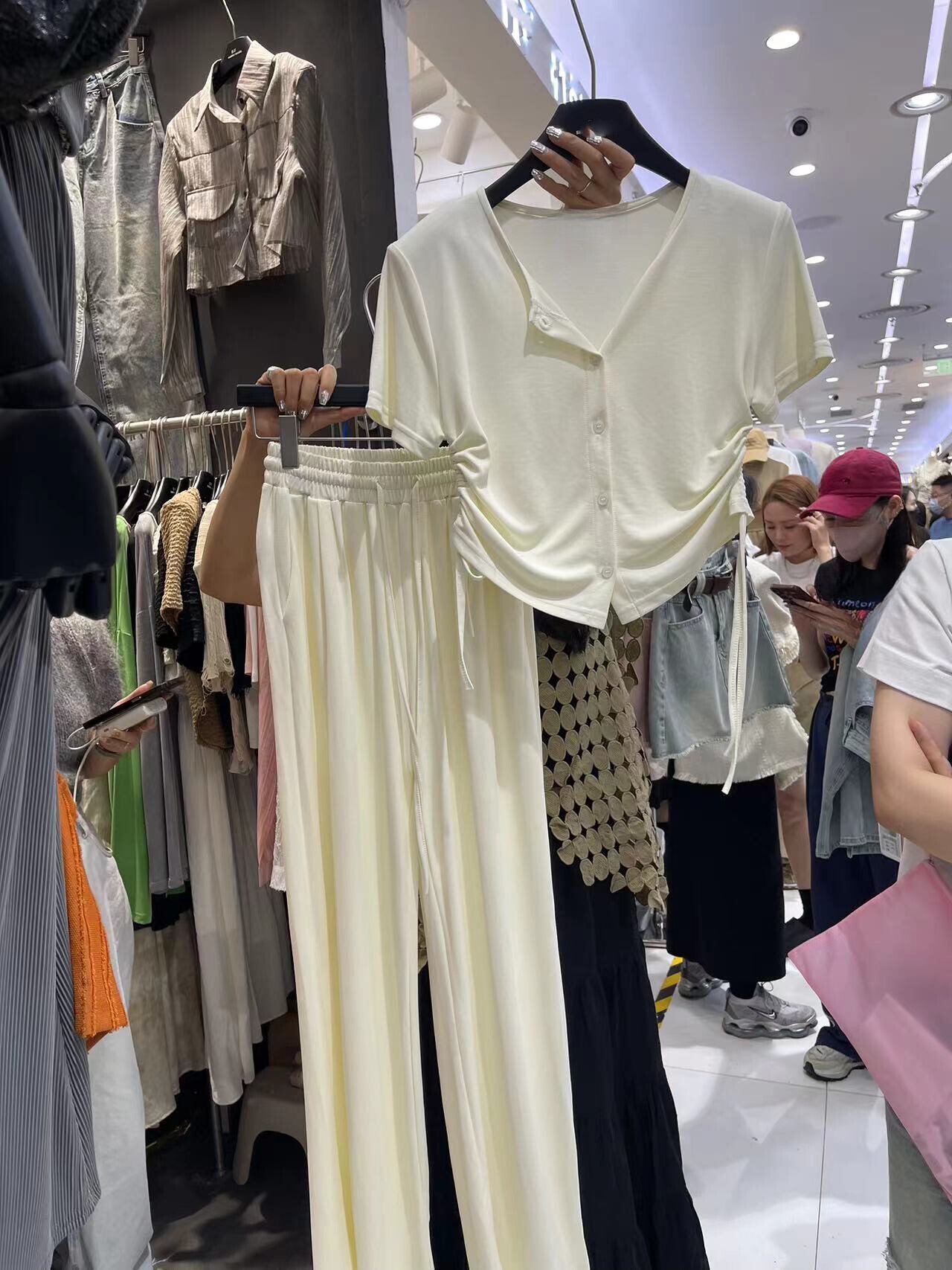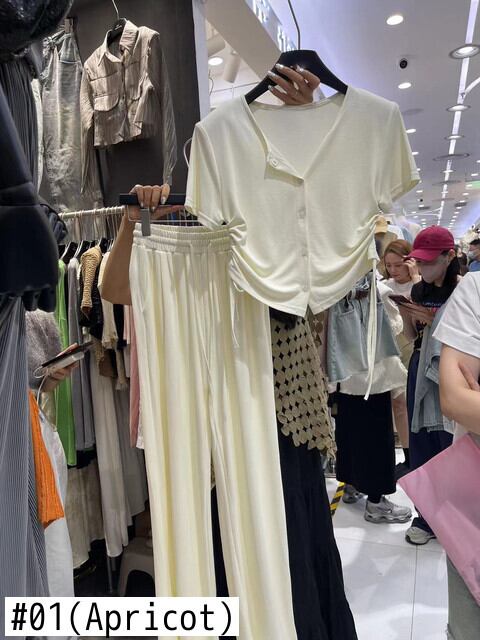 Nomikuma 夏 2 点セットレディース衣装半袖 Cardiagn T シャツ + ウエストゴムワイドレッグロングパンツ ショート ハーフスリーブ エラスティック 伸縮 サマー 夏物 ワイドパンツ