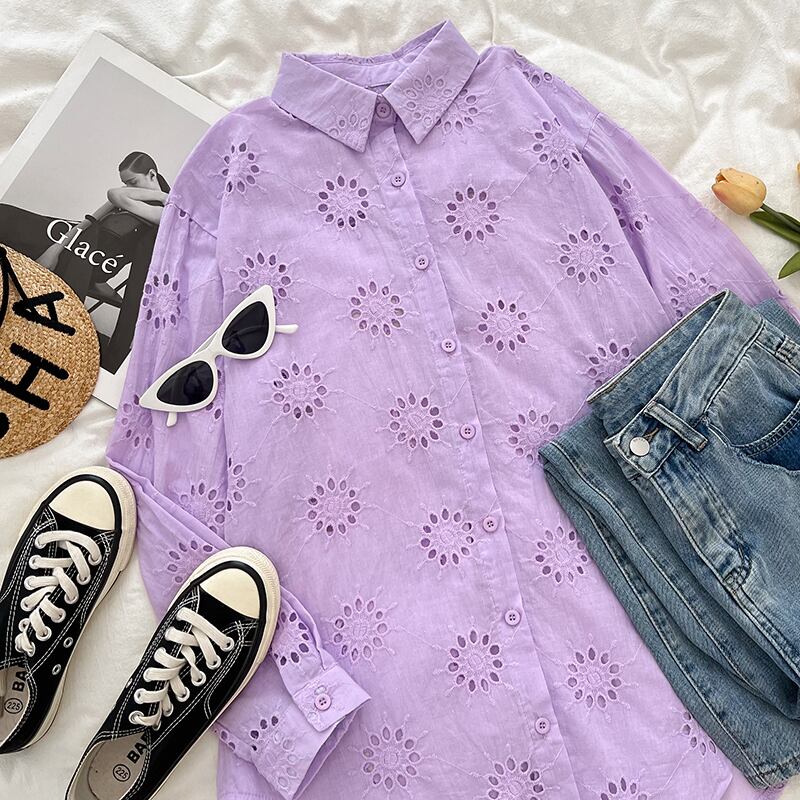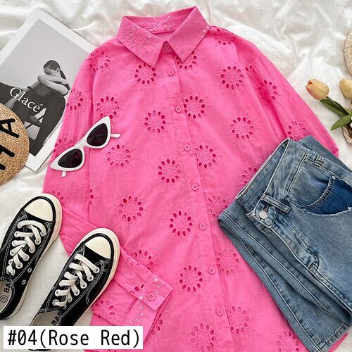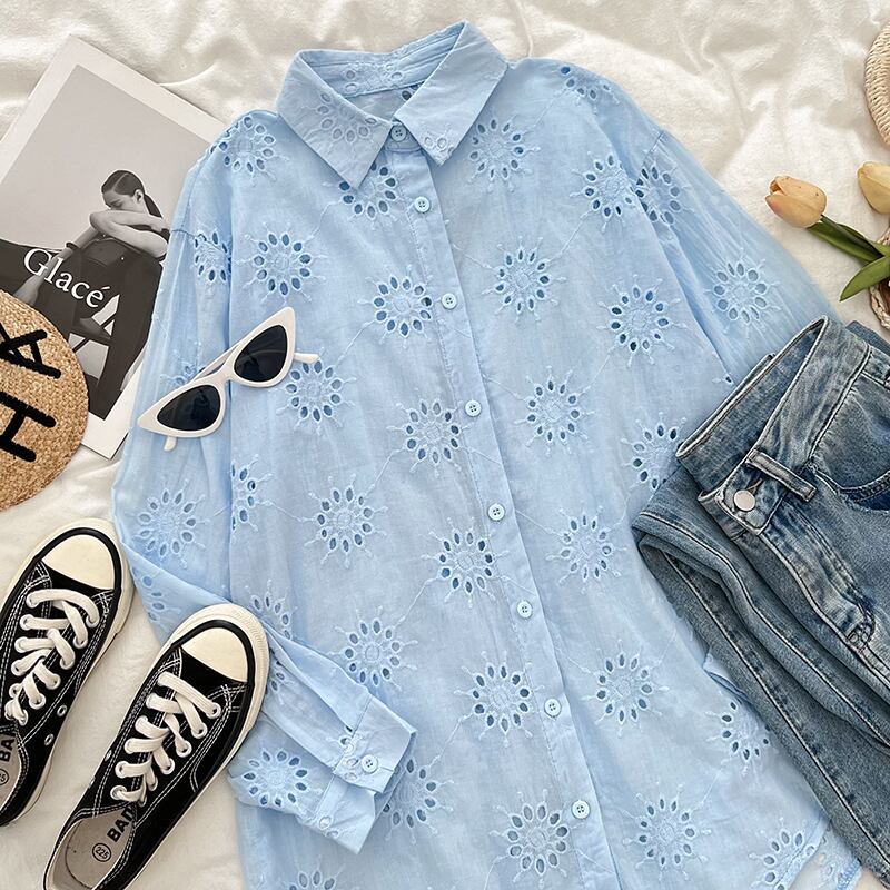 Nomikuma ターンダウン襟刺繍ホロウアウトフック因果長袖ミディアムロングブラウス日焼け防止シャツ