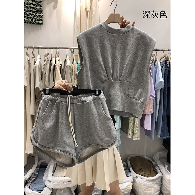 Nomikuma 夏ツーピースセットカジュアル O ネックノースリーブトップス + レースアップウエストワイドレッグショーツ衣装 サマー 夏物 ブルマー Oネック ワイドパンツ