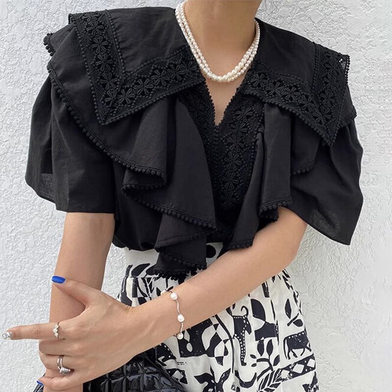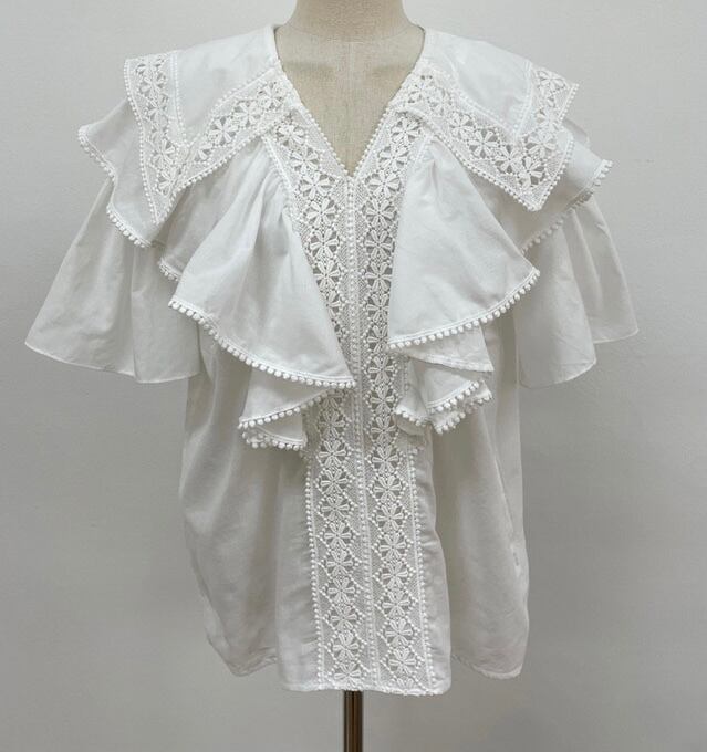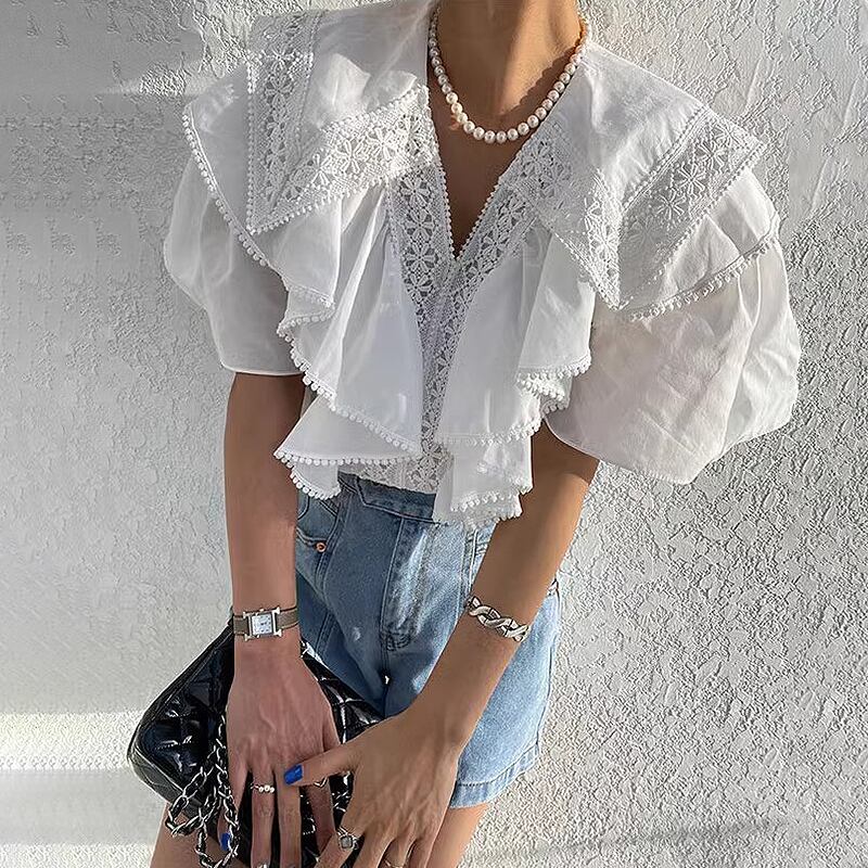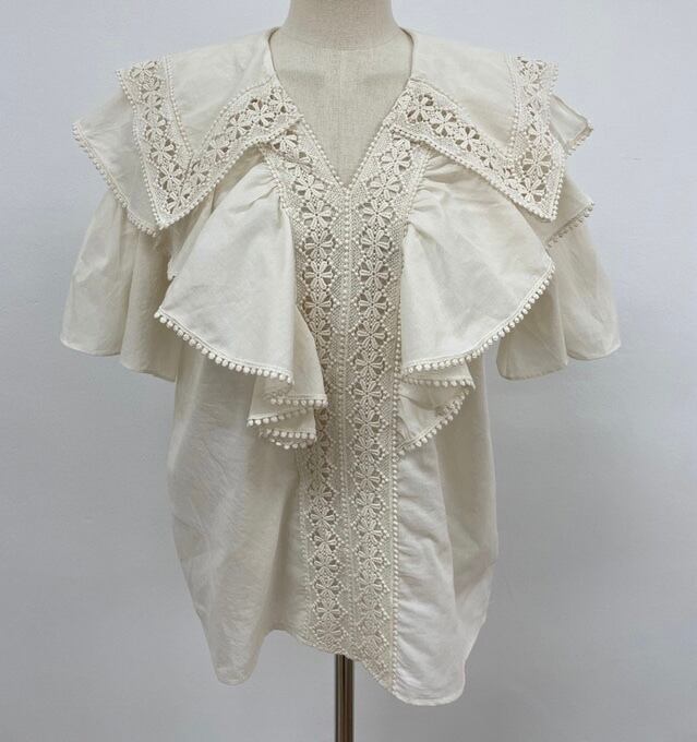 Nomikuma シックレースパッチワークフリル V ネックシャツバタフライスリーブプルオーバートップス夏デ サマー 夏物 Vネック