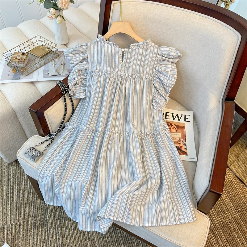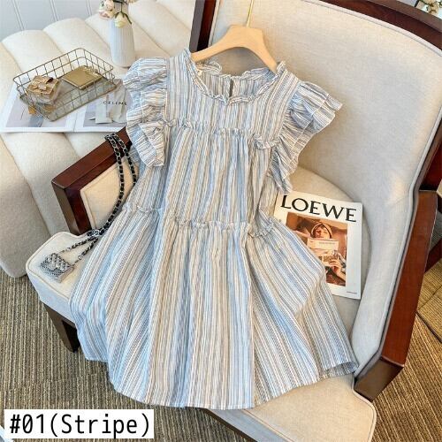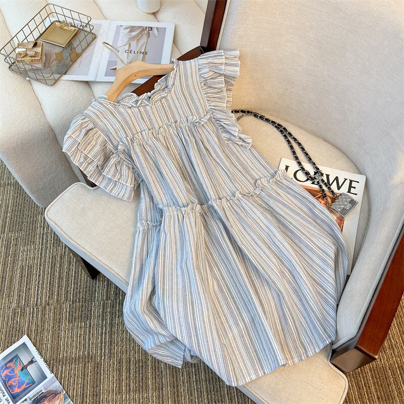 Nomikuma ストライプフライングスリーブフリルドレス夏因果 A ラインドレス Kroean シック甘い Vestidos デ 大人ガーリー スウィート キュート カジュアル サマー 夏物 Aライン
