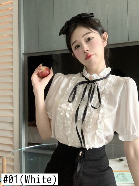 Nomikuma シックレースアップスタンドネックパフスリーブシャツサマーフリルパッチワークブラウスデ 夏物