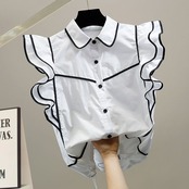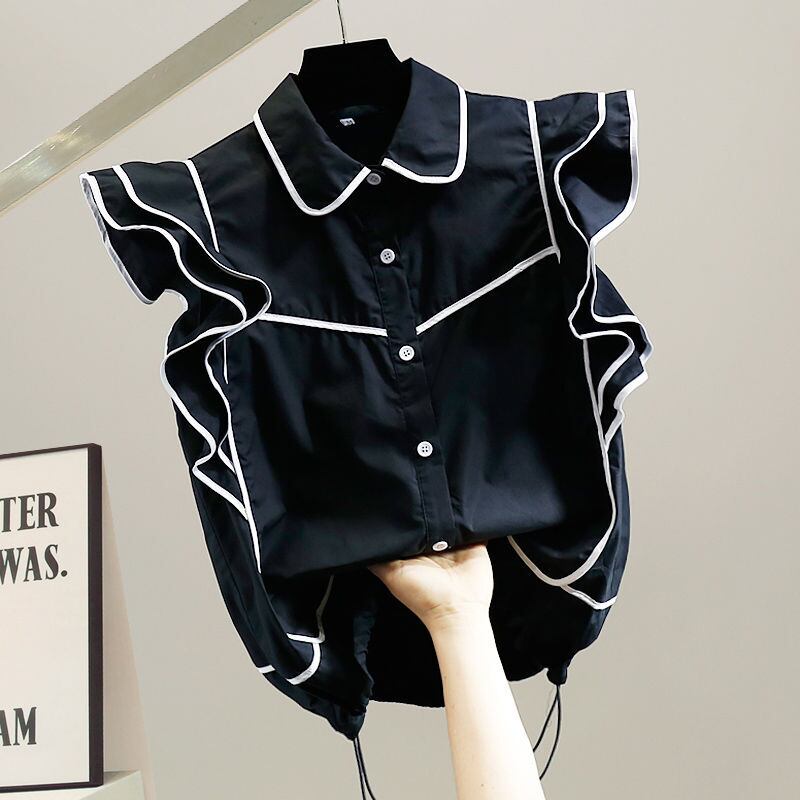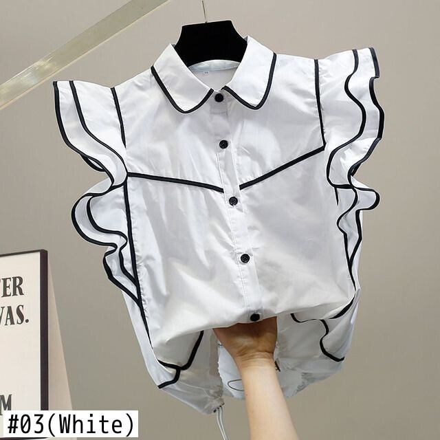 Nomikuma フリルヒットカラーパッチワークフライングスリーブストライプノースリーブブラウススリムウエストシャツデ