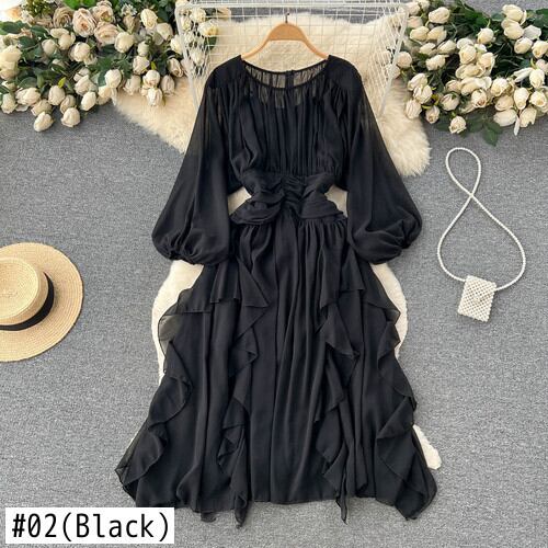 Nomikuma 春夏不規則フリルドレスパフスリーブ O ネックスリムウエスト A ライン Dres Vestidos スプリング 春物 サマー 夏物 Oネック Aライン