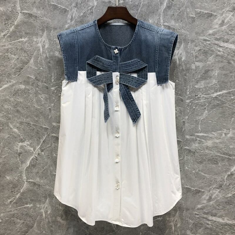 Nomikuma Demin パッチワークちょう結びフライングスリーブブラウス夏ミディアムロングカジュアルデ リボン サマー 夏物