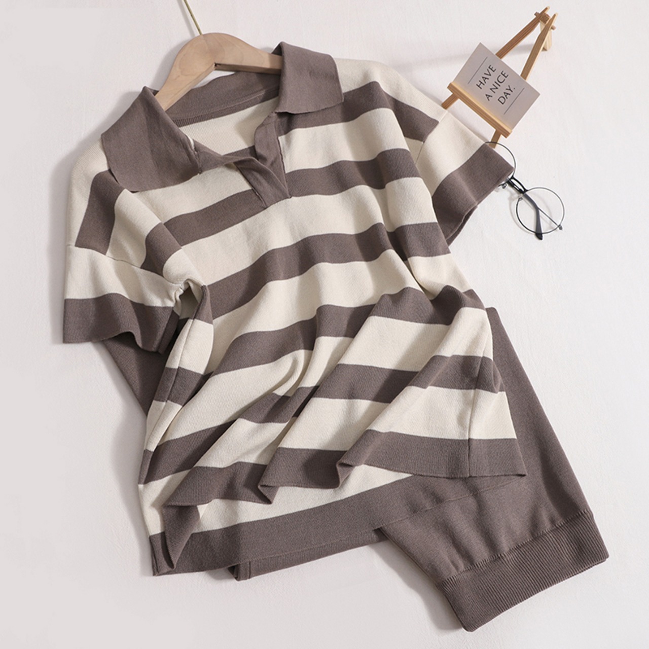 Nomikuma 因果ヒットカラーストライプターンダウン襟ニットトップス + ウエストワイドレッグロングパンツ 2 枚セット衣装 ワイドパンツ