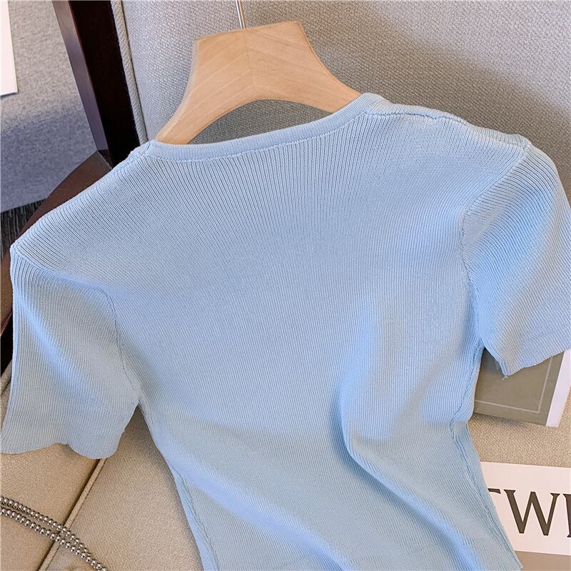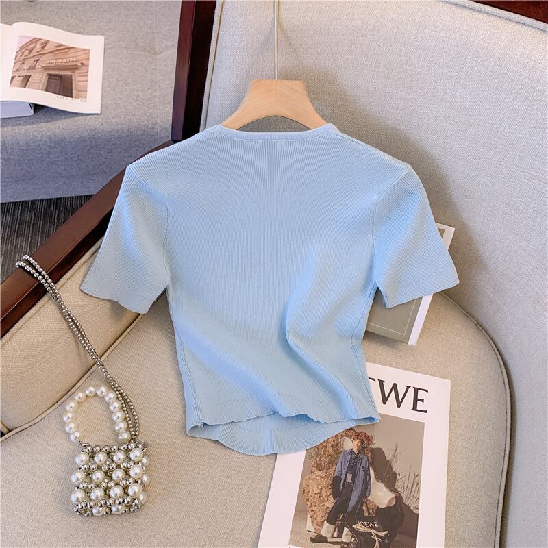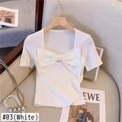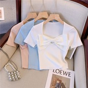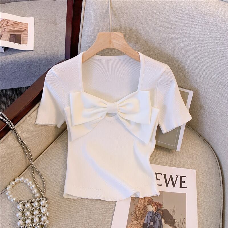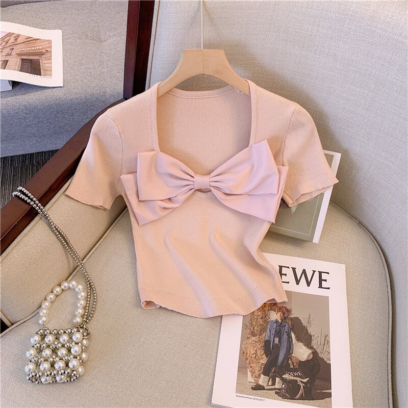 Nomikuma 夏甘いちょう結びスリム半袖ニットシャツシックトップススリム Y2k トップ ショート リボン ハーフスリーブ 大人ガーリー スウィート キュート カジュアル サマー 夏物