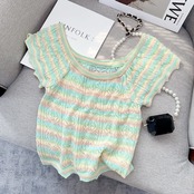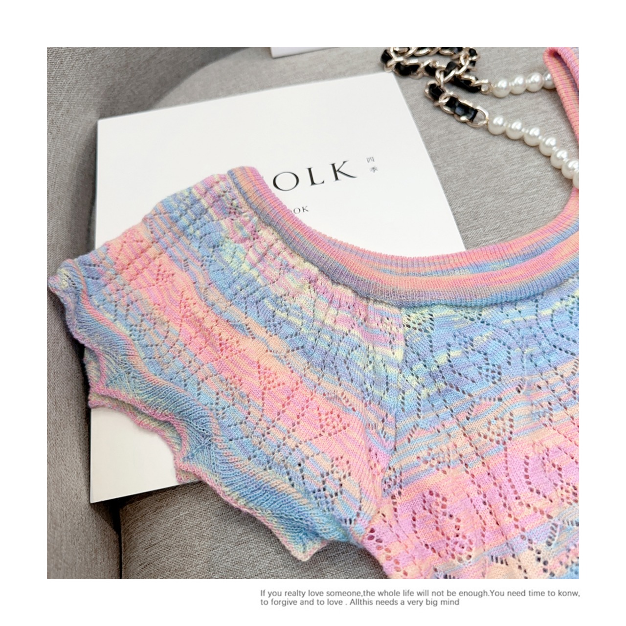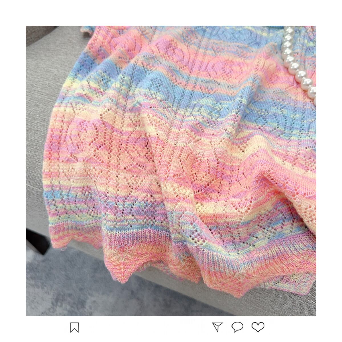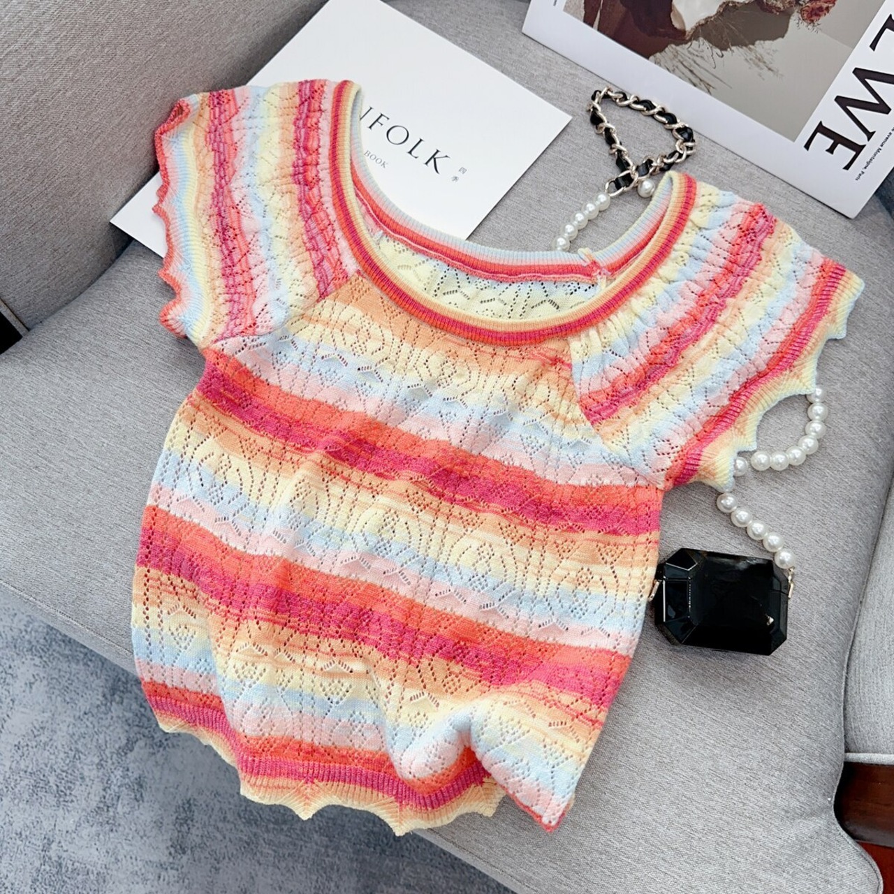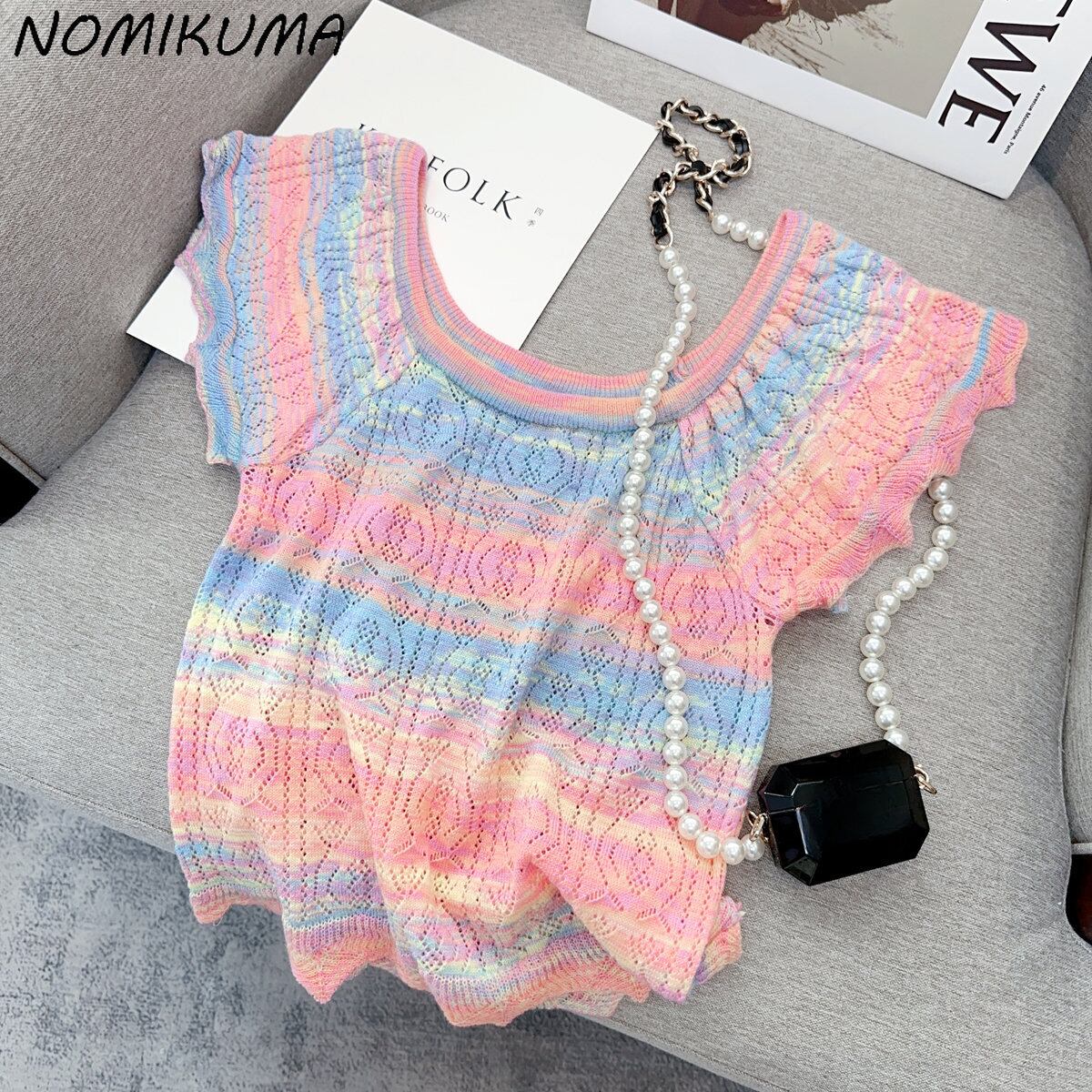 Nomikuma 中空オフショルダーレインボーストライプニットスリムショート Y2k トップシックフライングスリーブグラフィック Tシャツ