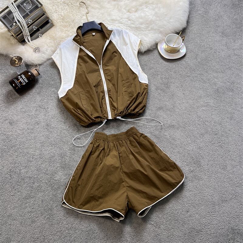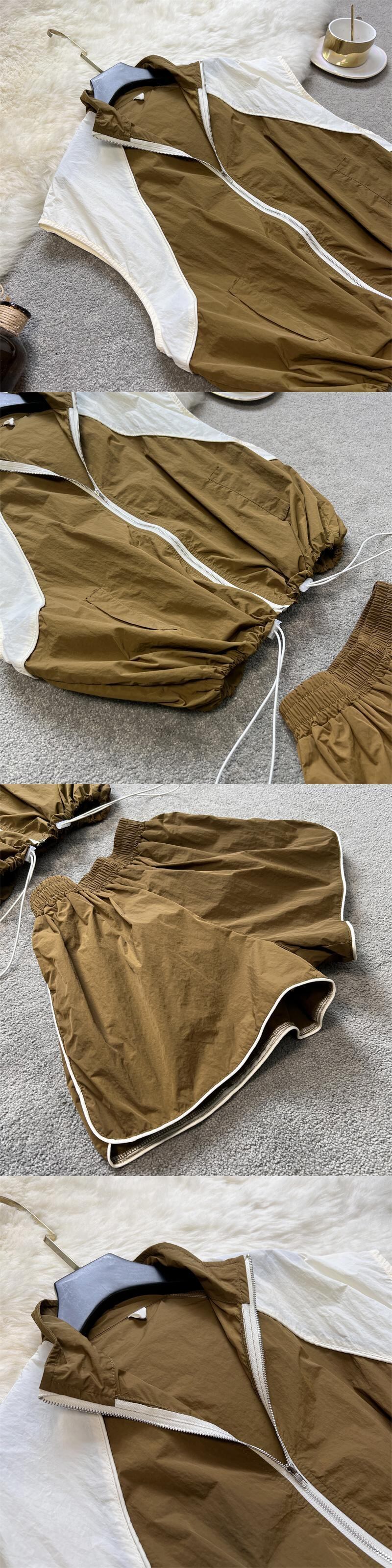 Nomikuma ツーピースセットレディース衣装コントラストカラージッパースタッドネック巾着サンスクリーンコート + ウエストワイドレッグショーツ ブルマー ワイドパンツ