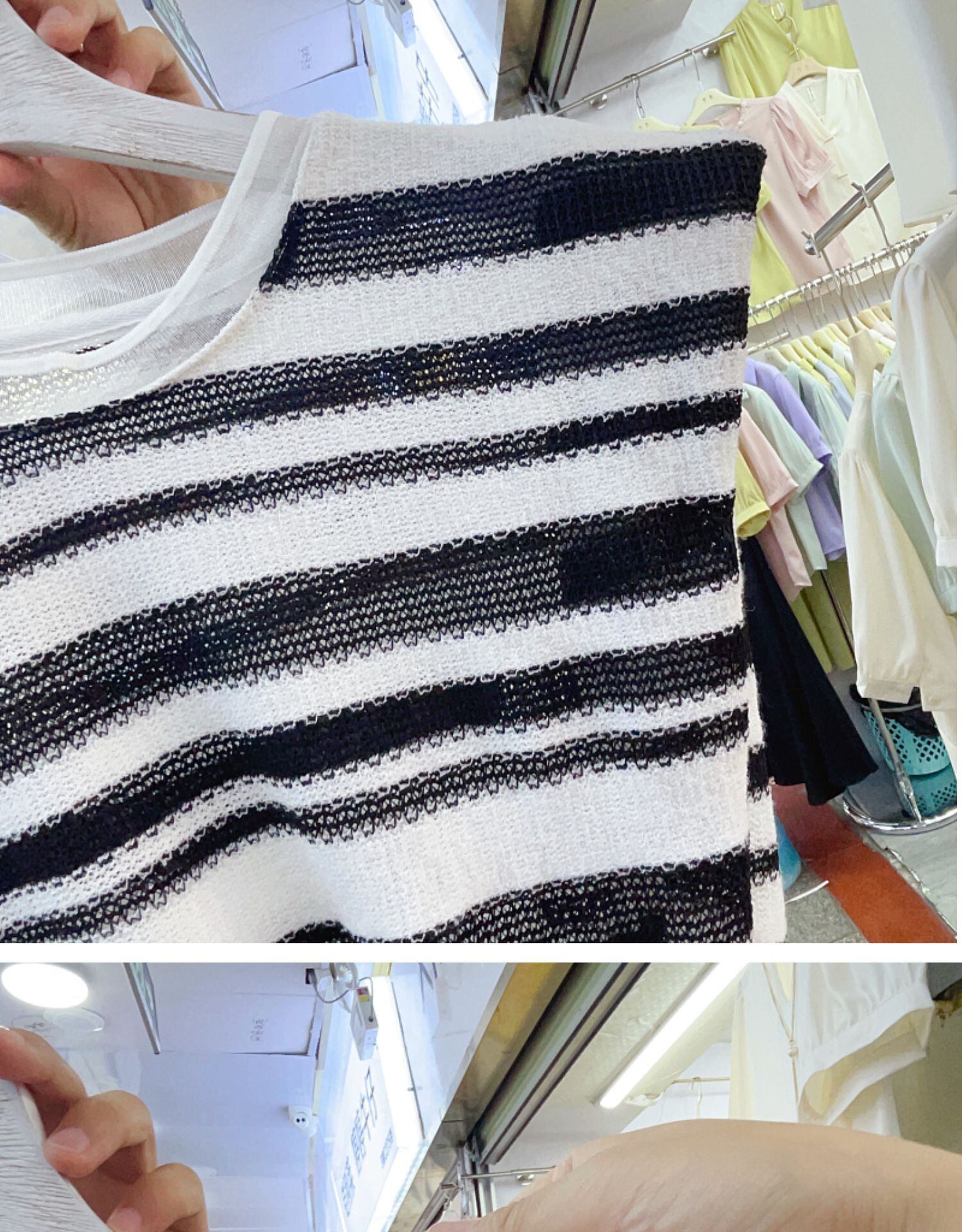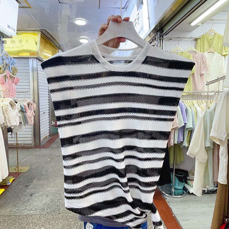 Nomikuma ストライプ中空ニットベスト夏プルオーバートップス弓包帯 O ネックタンク リボン サマー 夏物 Oネック