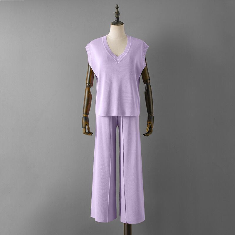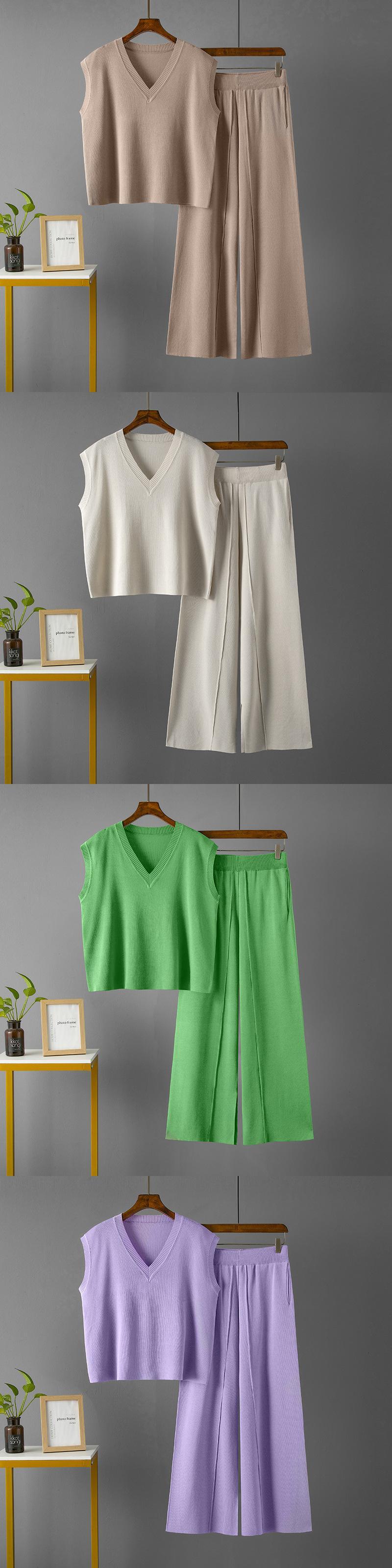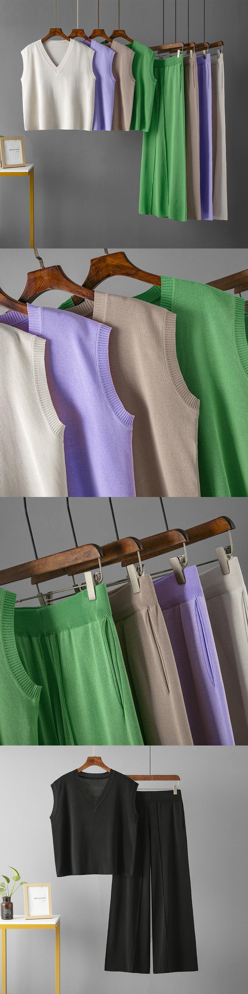 Nomikuma V ネック因果ノースリーブニットベストトップス + ウエスト因果スプリットワイドレッグパンツ 2 点セットレディース衣装 Vネック ワイドパンツ