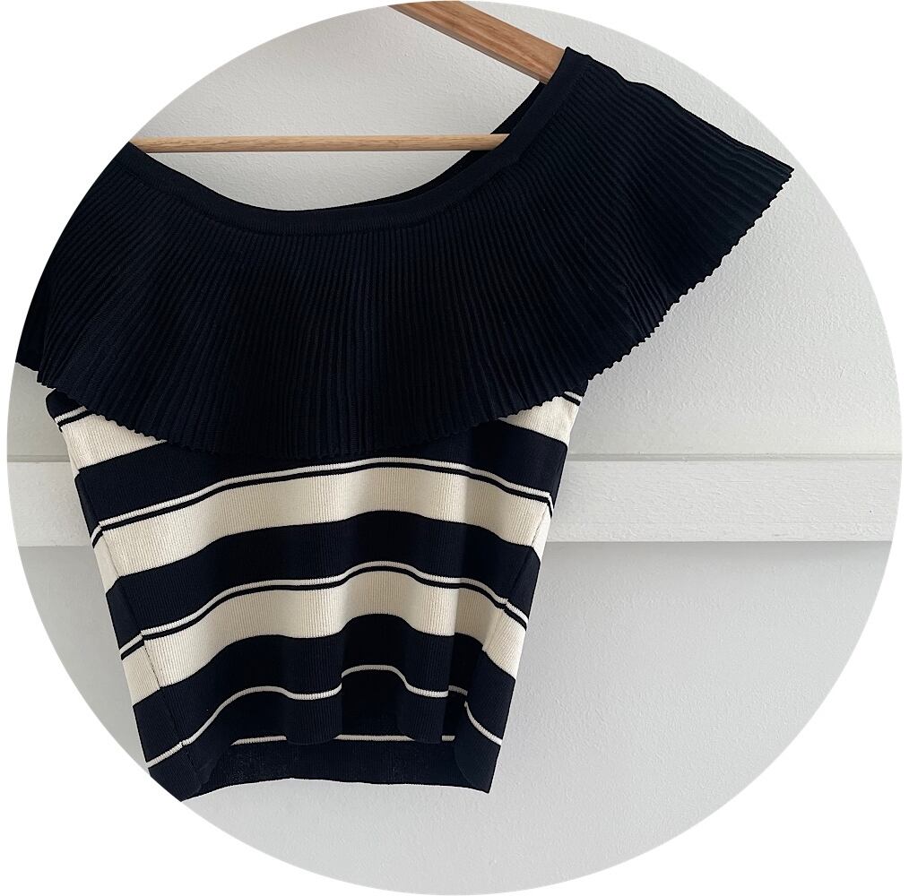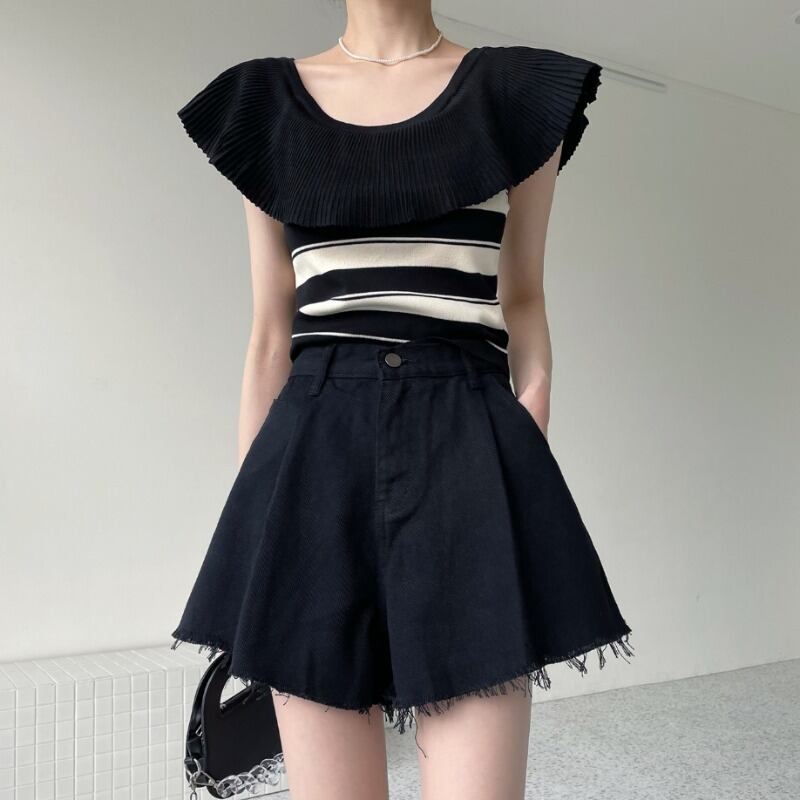 Nomikuma スパイシーガールオフショルダーフリルストライプニットトップス夏ストラップレスプルオーバーグラフィック Tシャツ サマー 夏物