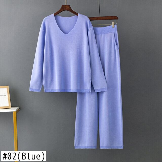 Nomikuma ソリッド V ネックプルオーバーニットセーターセット春秋カジュアルウエストロングパンツ 2 枚衣装 スプリング 春物 オータム 秋物 Vネック ソリッドカラー