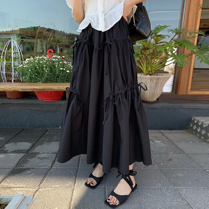 Nomikuma 因果巾着レースアップスカートレディース夏弾性ウエスト A ラインロングスカート段 Faldas デ エラスティック 伸縮 サマー 夏物 Aライン