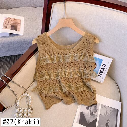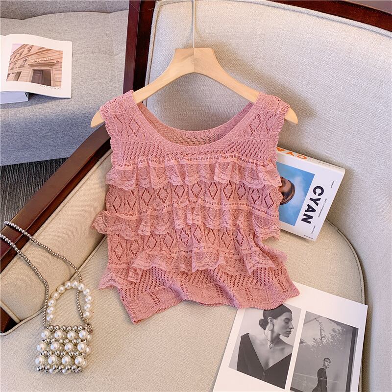 Nomikuma 甘いレースフリルパッチワーク中空ニットタンクトップノースリーブアイストップス夏プルオーバーベスト 大人ガーリー スウィート キュート カジュアル サマー 夏物 シルク