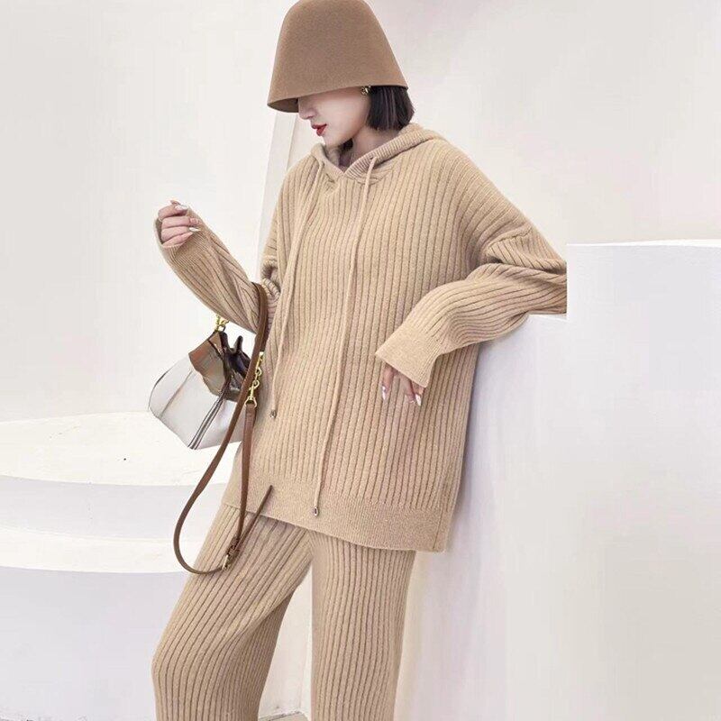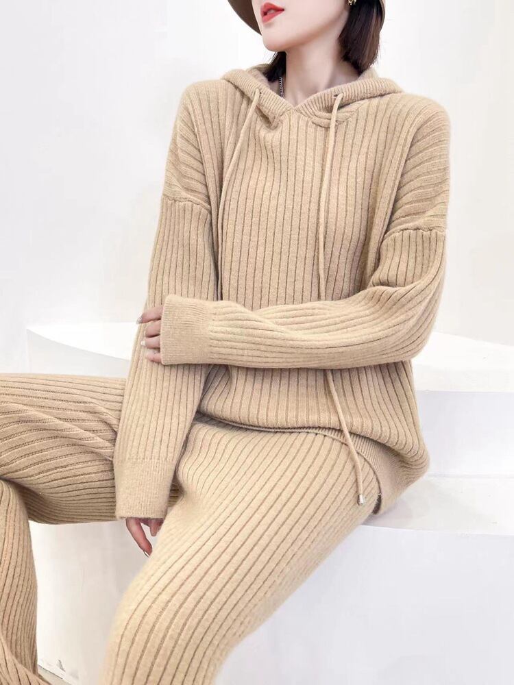 Nomikuma 秋冬ニットセットフード付きセータートップス 2 枚ウエストロングパンツ衣装 オータム 秋物 ウィンター 冬物