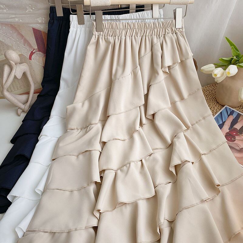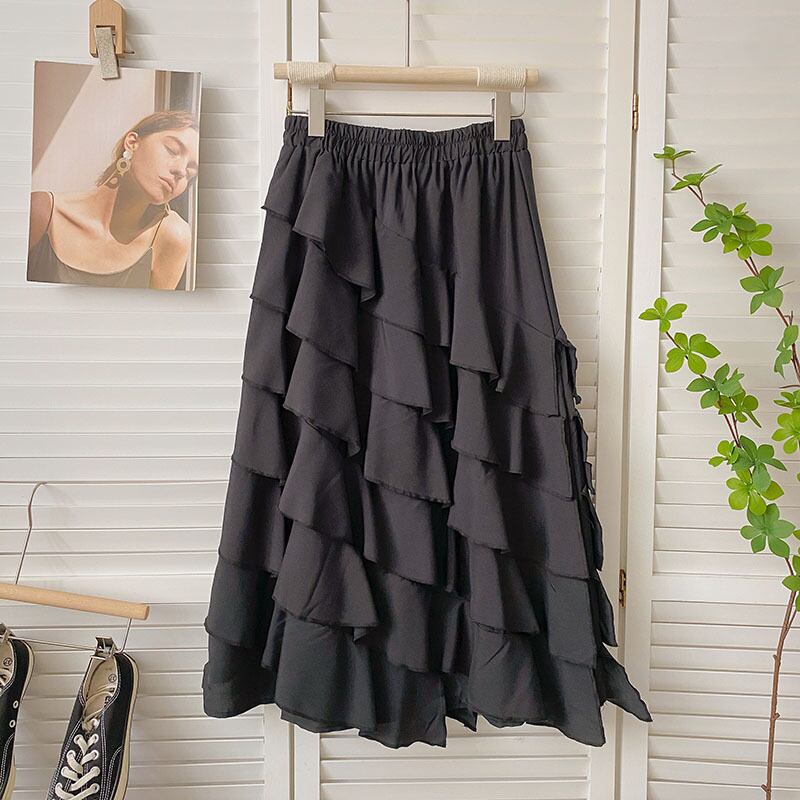 Nomikuma 不規則レイヤードフリルパッチワークゴススカート夏ウエストゴムカジュアル A ラインロングスカート Fladas De エラスティック 伸縮 サマー 夏物 Aライン
