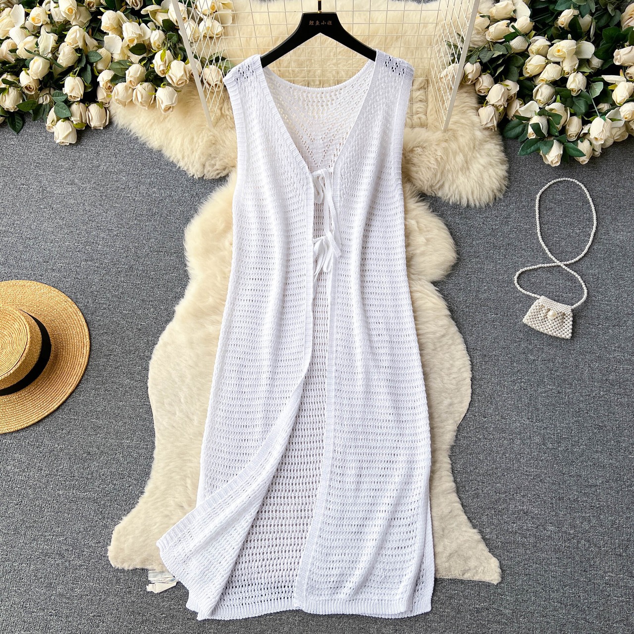 Nomikuma 中空ニットノースリーブショール夏シックミディアムロングレースアップカーディガンコート サマー 夏物