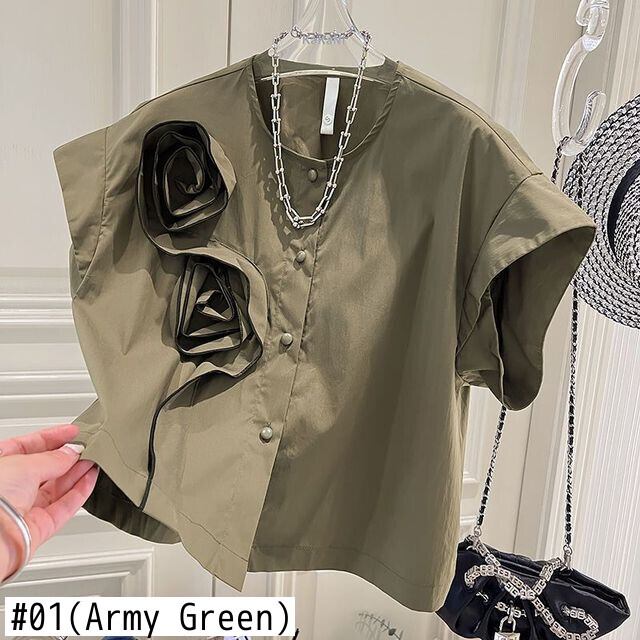 Nomikuma シック 3D フラワー ブラウス レディース 半袖 O ネック シャツ 夏 カジュアル デ ショート ハーフスリーブ サマー 夏物 Oネック フラワーデザイン