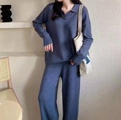 Nomikuma 秋冬カジュアルニットセットターンダウンカラーセーター + ウエストワイドレッグセーターパンツ オータム 秋物 ウィンター 冬物 ワイドパンツ