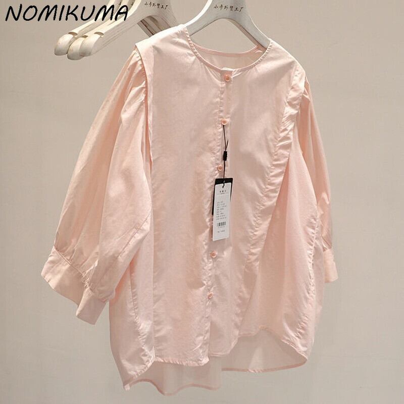 Nomikuma 甘いパフスリーブ人形シャツ夏カジュアルシングルブレスト O ネックブラウスシック 大人ガーリー スウィート キュート サマー 夏物 Oネック