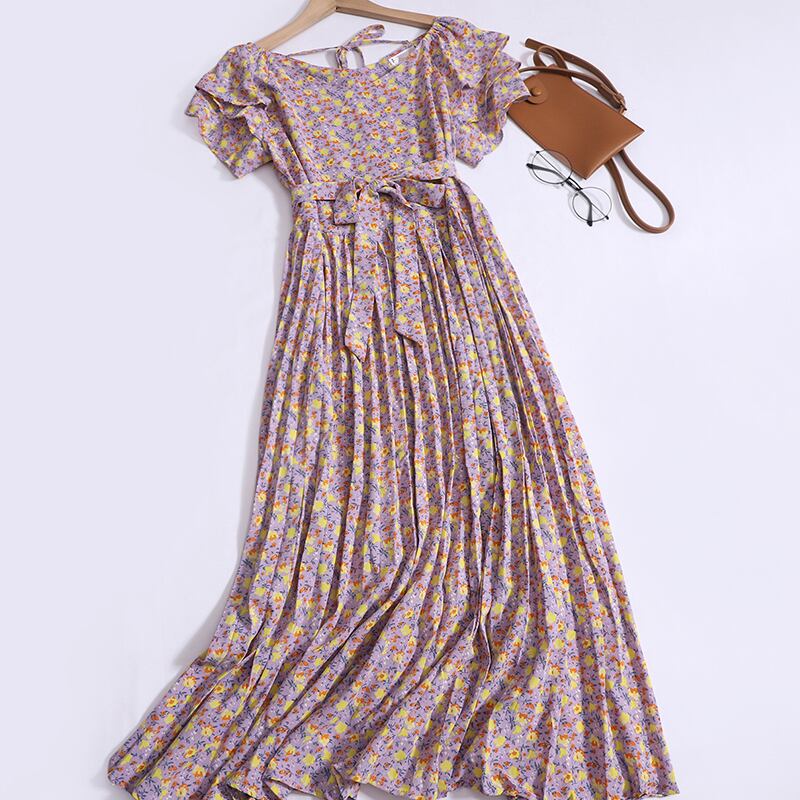 Nomikuma 花ドレスシックフライングスリーブレースアップ O ネックサマードレス包帯スリムウエスト A ラインロング Vestidos 夏物 花柄 Oネック Aライン