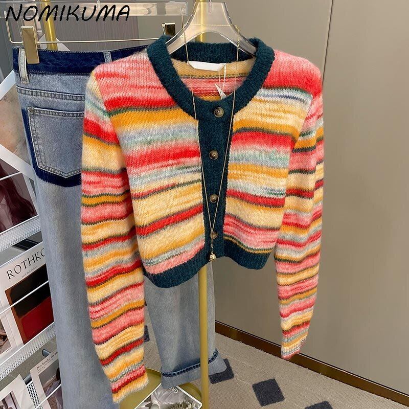 Nomikuma 秋レインボーストライプニットカーディガンショートニットショートセーターコートセーターデ オータム 秋物