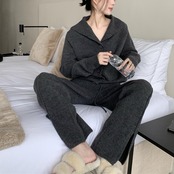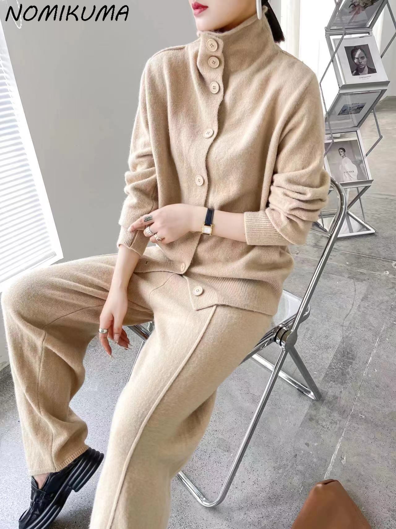 Nomikuma ニットセット秋冬シングルブレストタートルネックセータートップス + レースアップウエストワイドレッグロングスプリットパンツ オータム 秋物 ウィンター 冬物 ワイドパンツ